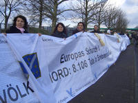 Nel frattempo davanti alla caserma si è tenuta una pacifica azione di protesa organizzata da diverse associazioni bosniache e non. La Gesellschaft für bedrohte Völker (Società per i popoli oppressi) ha posto davanti all’ingresso principale uno striscione lungo 60 metri con i nomi di 1.806 uomini e ragazzini di Srebrenica e dintorni. I nomi sono stati letti mentre all’interno era in corso la cerimonia.