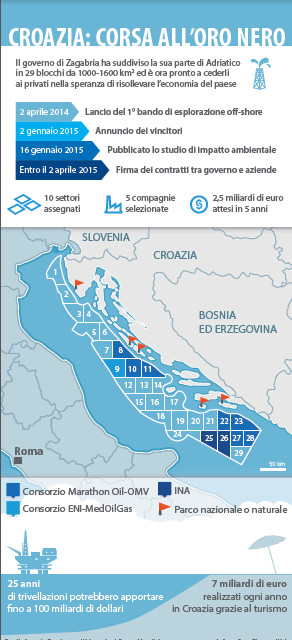 Da Nord a Sud, il mare croato veniva allora diviso in 29 riquadri da 1.000–1.600 km2. I numeri 1, 23, 28 e 29 si spingevano fino ai confini con le acque territoriali slovene e montenegrine, e senza che ciò ponesse un problema al governo socialdemocratico, alla neonata Agenzia croata per gli idrocarburi (AZU) o alle stesse compagnie energetiche che hanno depositato le proprie candidature. A cosa è dovuto allora questo dietrofront che arriva peraltro cinque mesi dopo la deadline del 2 aprile 2015 imposta da Vrdoljak per la firma dei contratti dettagliati con le aziende?