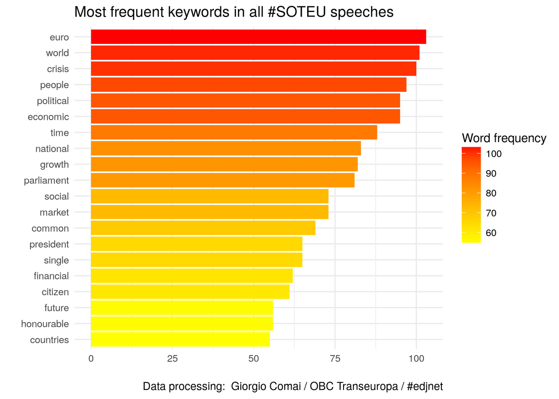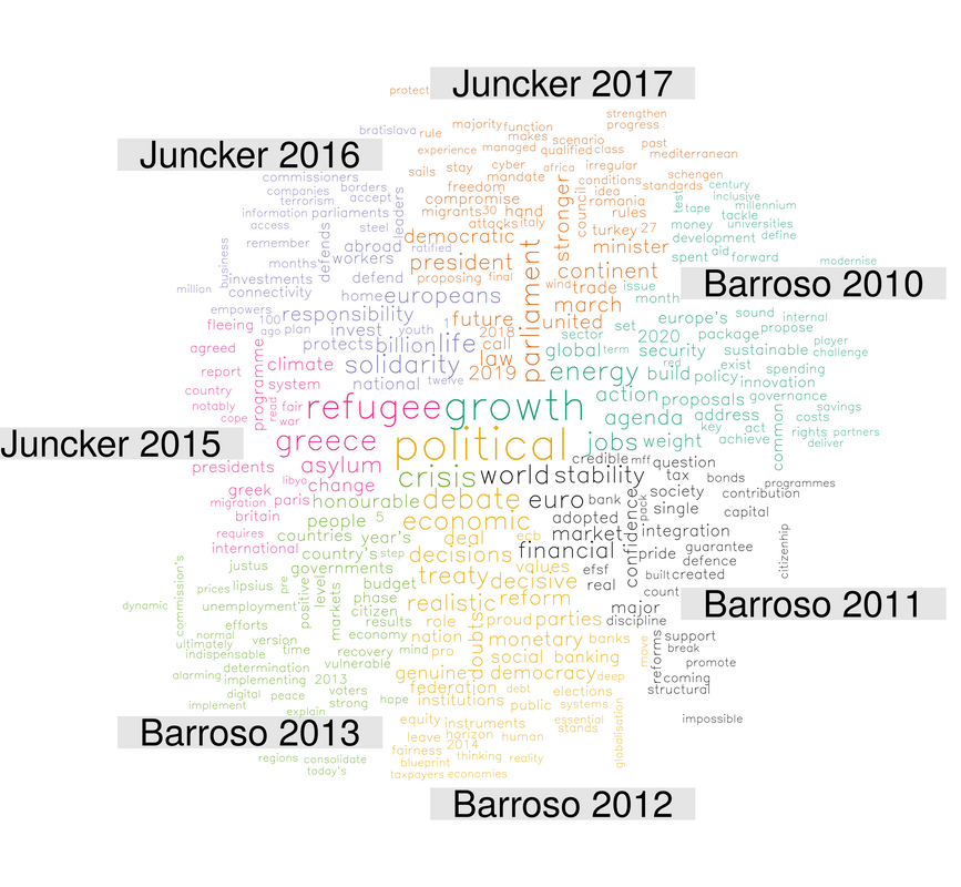 It’s the closest thing the EU has to a general policy speech by a national chief of government. Therefore, it is interesting to have a closer look at its language and the words that are used, as they speak for which concepts and issues have been marking a specific period, and what the EU is – and will be – focusing on.