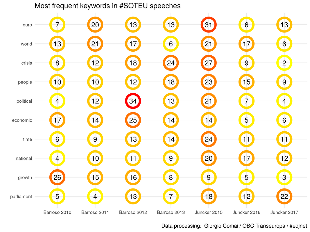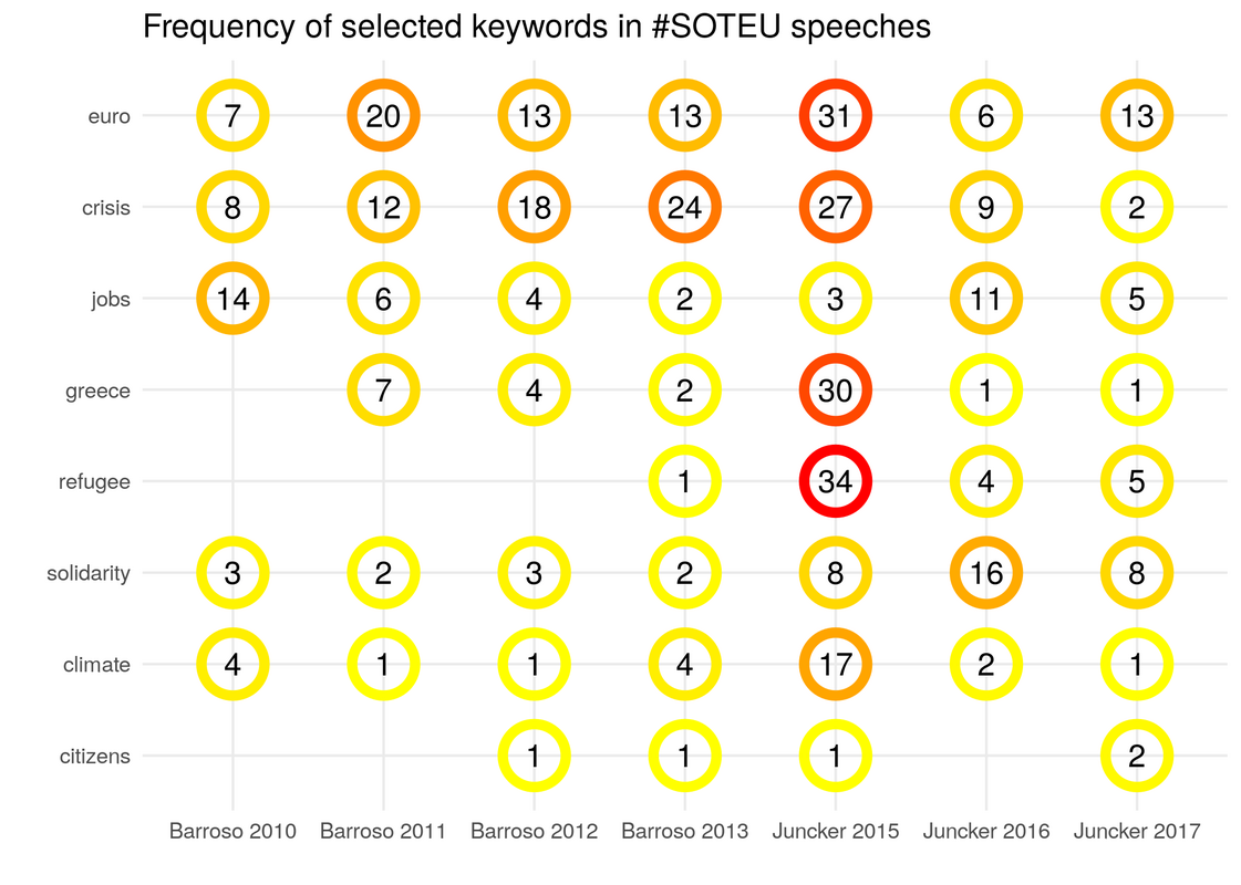 The figure refers to the number of times the most frequent words in all Soteu speeches are pronounced during each of them. The colour of the circle reflects these data, with red reflecting more mentions.