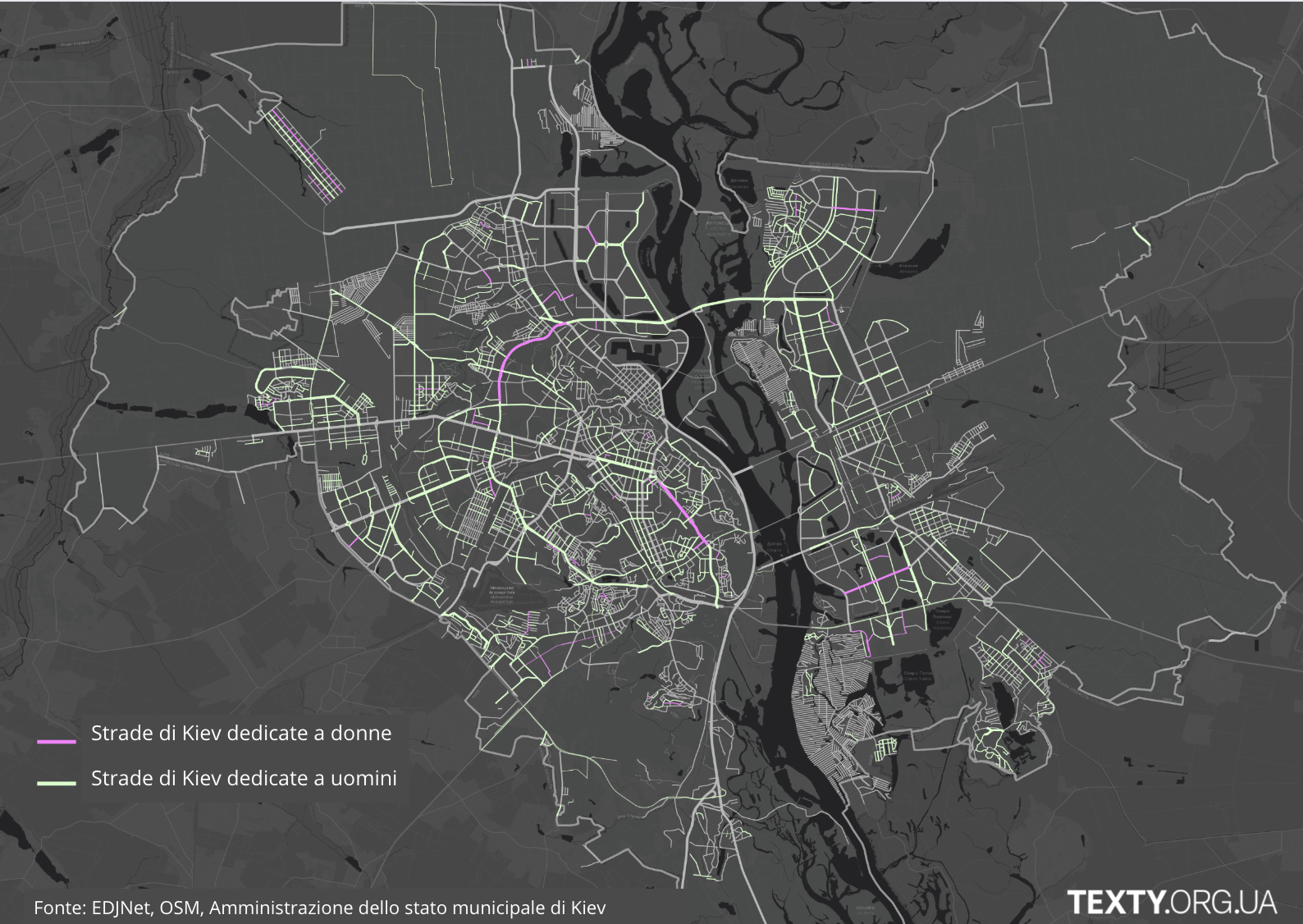 I dati rivelano che a Kyiv solo il 6% delle strade è intitolato a donne – un valore in linea con quello di molte altre città europee prese in considerazione. Prima delle ridenominazioni, il numero era ancora più basso.