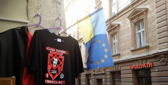 Bandera è un brand. A Ternopil’, Ivano-Frankivsk, Leopoli ma anche a Kiev è sulle magliette, sulle bandierine per le auto, sulle tazze per il tè, sulle spille. Si può dire che chi le indossa è un neonazista antisemita? “Non abbiamo ancora fatto i conti per bene con la nostra storia recente”. Aleksandr vuole essere chiamato Alessandro. È uno dei “bambini di Černobyl”. Ha trascorso molte estati sul litorale romano e parla italiano come se fosse sempre vissuto a Ostia, anche se oggi abita a Kiev e in Italia non ci viene più. “Che vuoi, con l’isolamento sovietico la storia era solo quella dei libri scritti a Mosca. E poi dopo è stato un po’ un fai da te. Ognuno ha ripescato eventi e personaggi che facevano comodo, senza passare per una seria analisi storica. Certo, ora sarebbe il caso di farlo, ma questo non vuol dire che tutti quelli che ricordano Bandera come un eroe nazionale siano razzisti e antisemiti”.