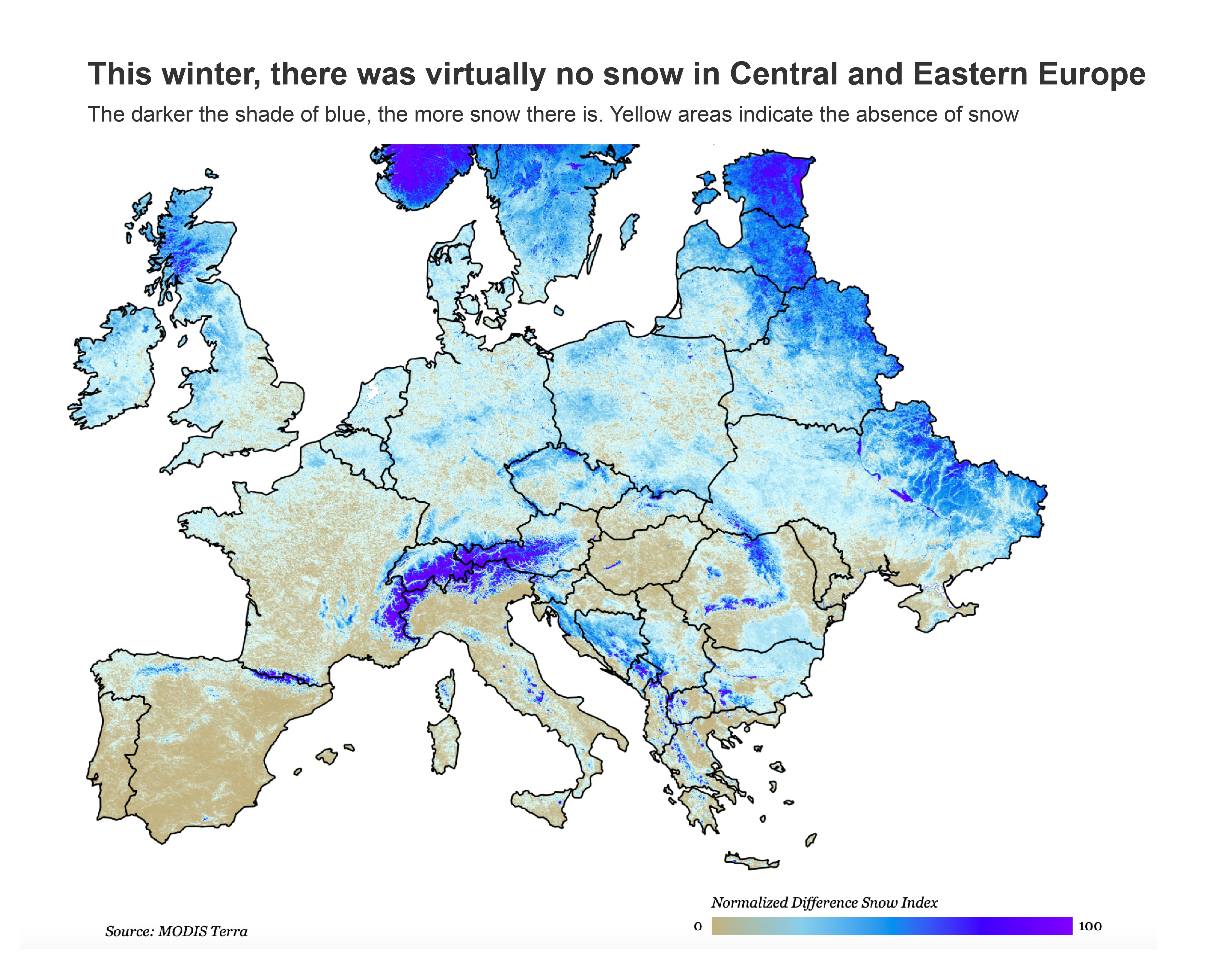 The images from the 2024-2025 winter show that, beyond the non-mountainous areas of Southwestern Europe (which are normally snow-free), countries like Hungary, Serbia, Moldova, Croatia, Poland, and Western Ukraine have had very little snow.