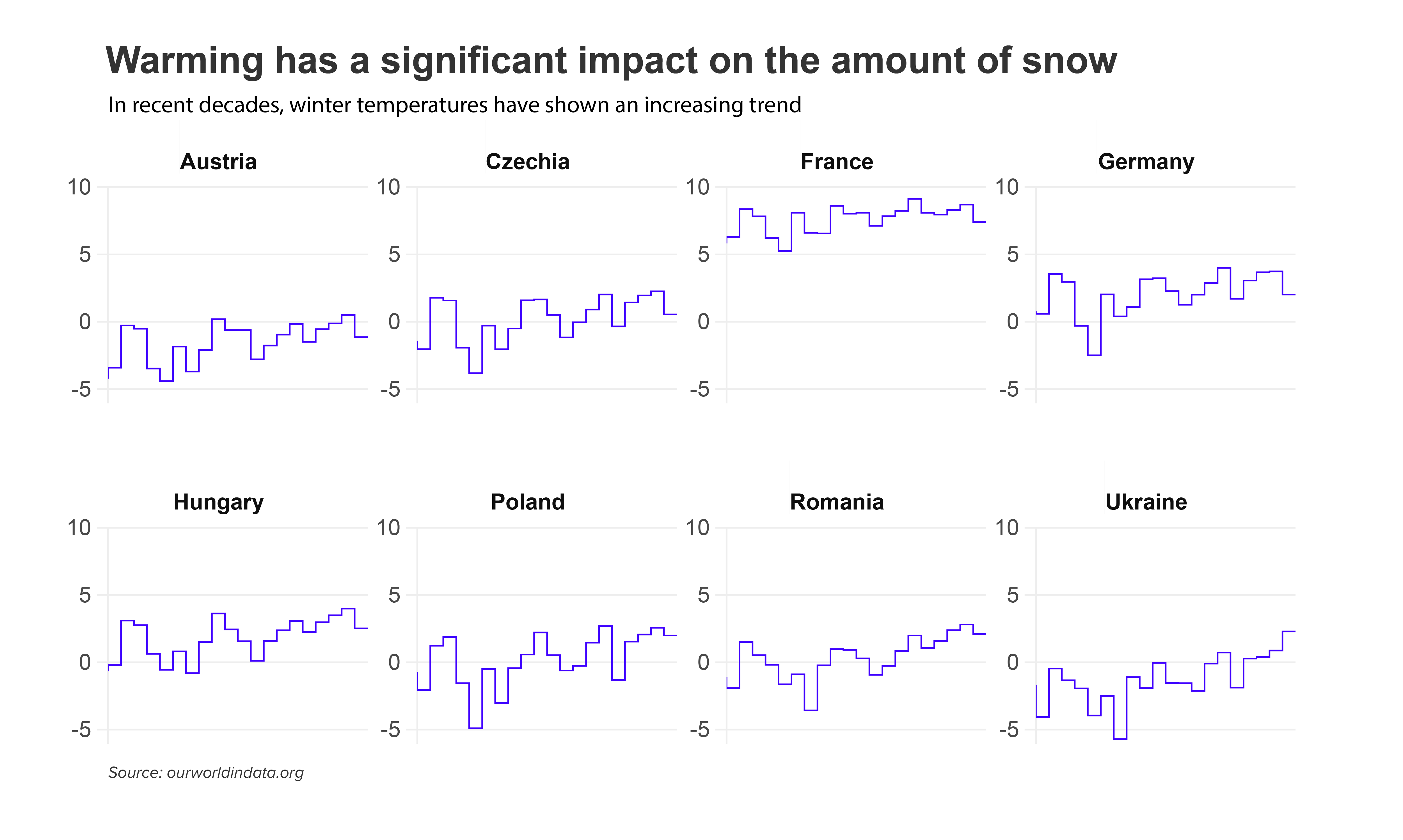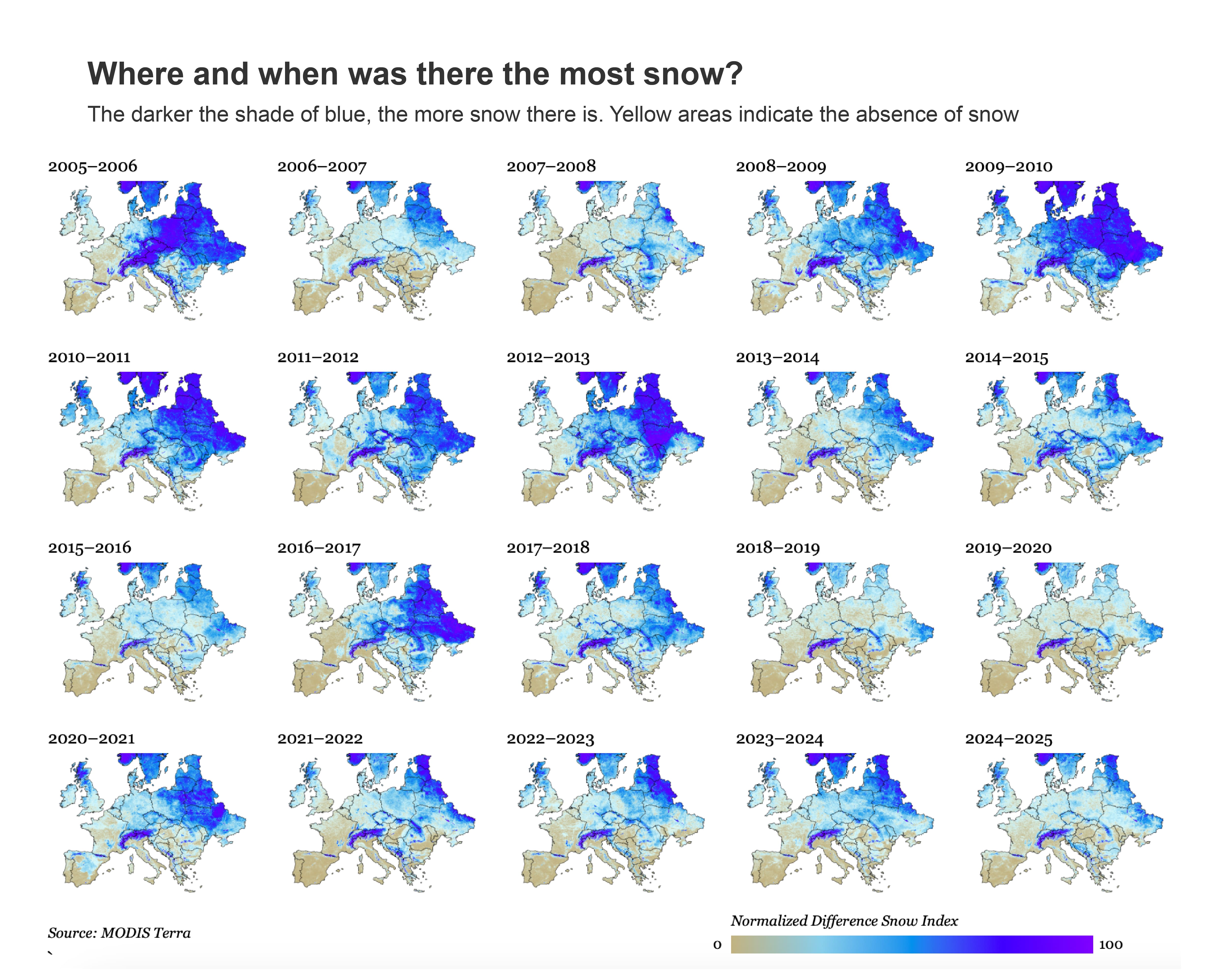 Once, the plains of Central-Eastern Europe and the continent’s mountains used to evoke long, snowy winters. That image is progressively fading: the snow cover is becoming increasingly scarce and less lasting, with rare exceptions. The phenomenon has repercussions on tourism, agriculture, and water availability, but is difficult to quantify due to data scarcity and local variability. An analysis within EDJNet using MODIS satellite data, corroborated by an investigation in the meteorological archives of the ECAD network (European Climate Assets Datasets), has provided a picture of the drastic reduction in snow cover.