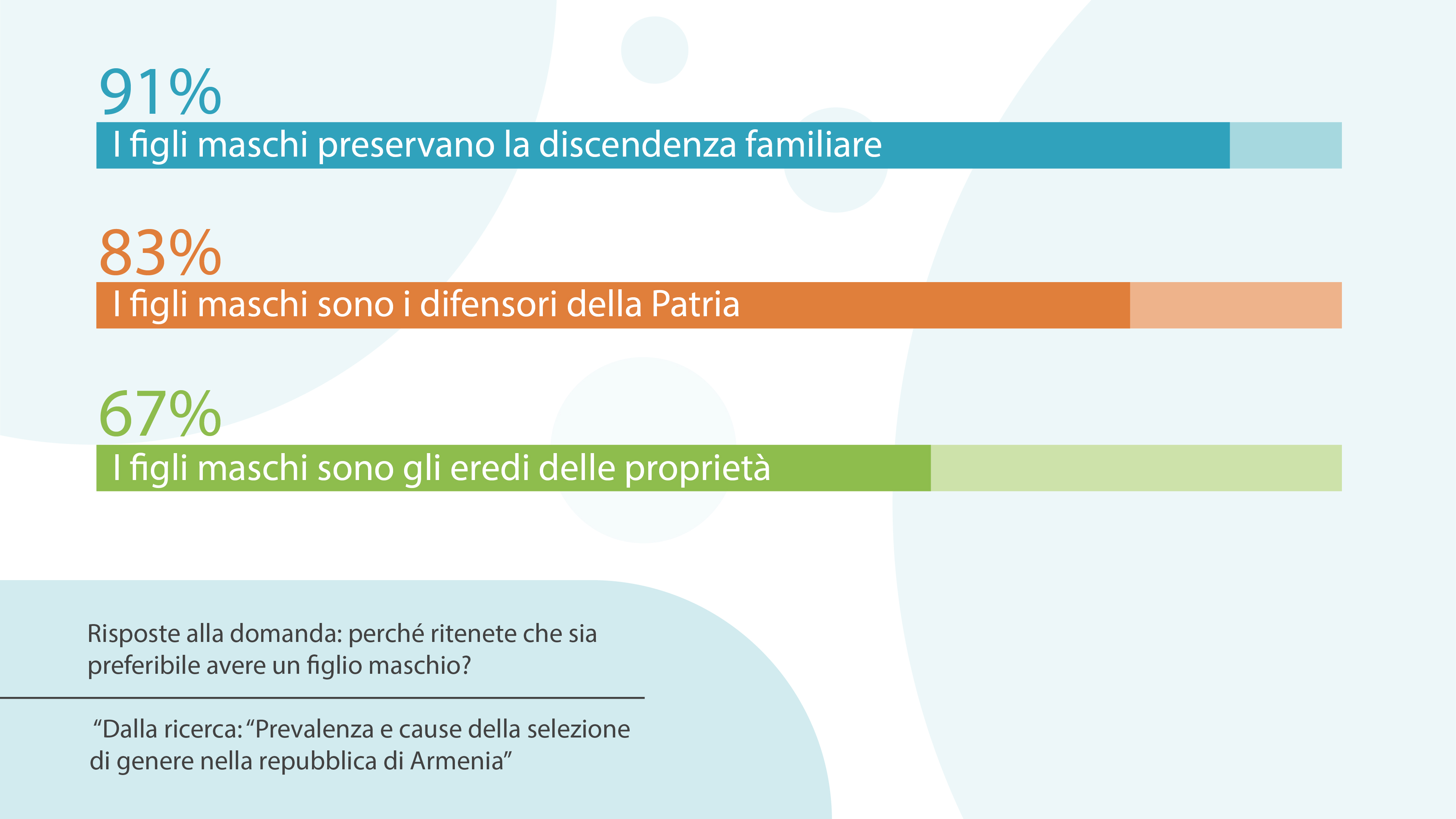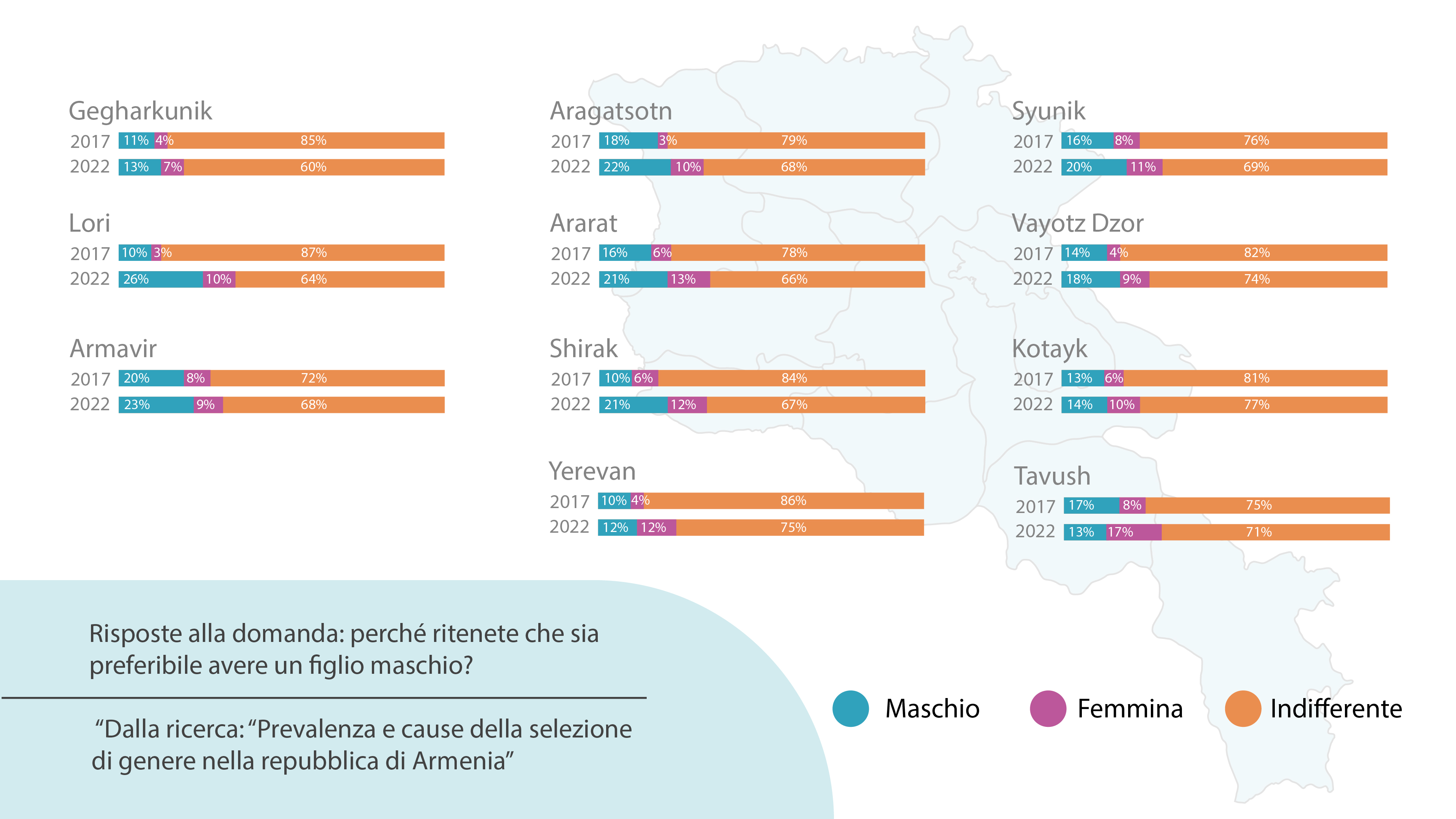 I risultati dimostrano chiaramente che la preferenza per i figli maschi è maggiormente diffusa nella regione di Gegharkunik dove il 33% degli intervistati ha affermato di essere più incline ad avere un figlio maschio.
