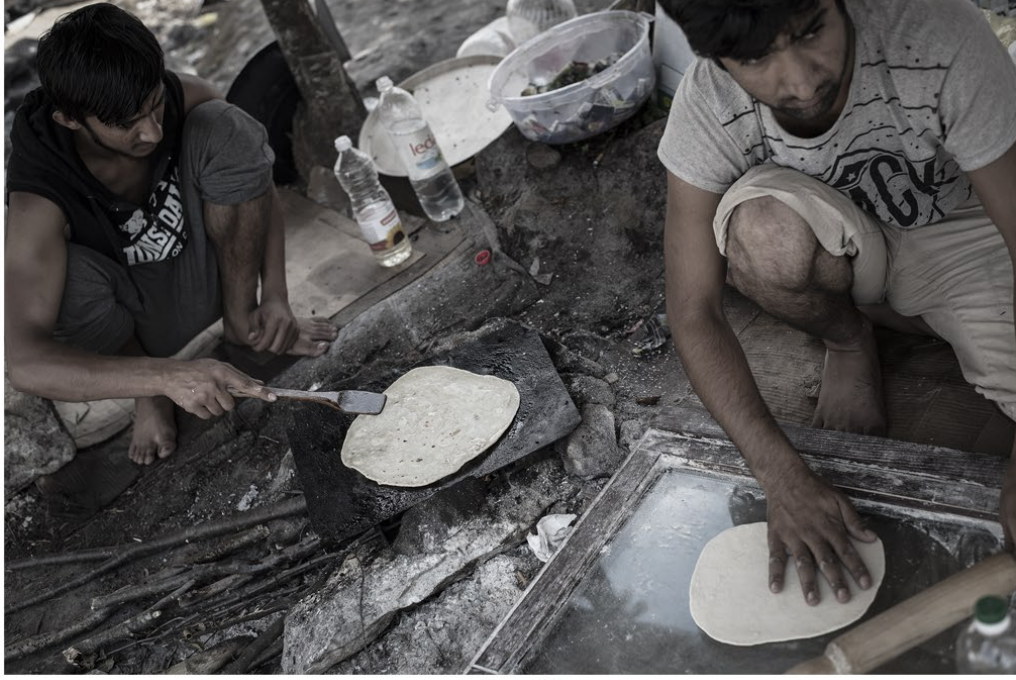 La fatica, e la speranza, si legge anche negli oggetti, d’altronde. Gli zaini piccoli ma stracolmi di provviste per mettersi in viaggio, giacche a vento nel caso di piogge o temperature rigide, pantaloni lunghi contro rovi e insetti. E poi acqua, incalcolabili bottiglie d’acqua perché con l’umidità e il sole il rischio di disidratarsi è alto. Cibo e bevande non sembrano mancare, qui a Vučjak. Qualcosa lo passa la Croce Rossa locale, ogni giorno. Ma sono le persone che vivono qui a provvedere alla maggior parte dei consumi. Ci sono piccoli mercatini interni dove si può acquistare qualcosa, qualche genere di prima necessità. E poi si cucina ovunque, con fuochi improvvisati, per ore. E ciò che si cucina lo si divide con i compagni di tenda (fino a 10 persone per tenda, su materassi tanto sottili quanto impregnati di umidità), e con chi passa da qui. Come noi, a cui costantemente viene offerto qualcosa da mangiare e da bere.