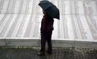Dall’altra parte della strada c’è il cimitero. Su un semicerchio di marmo ogni anno si incidono i nomi degli uccisi, i cui resti sono trovati nelle fosse comuni. La notte precedente nevicava. Il vento spostava la neve da una parte, lasciando scoperta una striscia con i nomi: 54 persone con lo stesso cognome. Uno, Esad, aveva solo 13 anni.