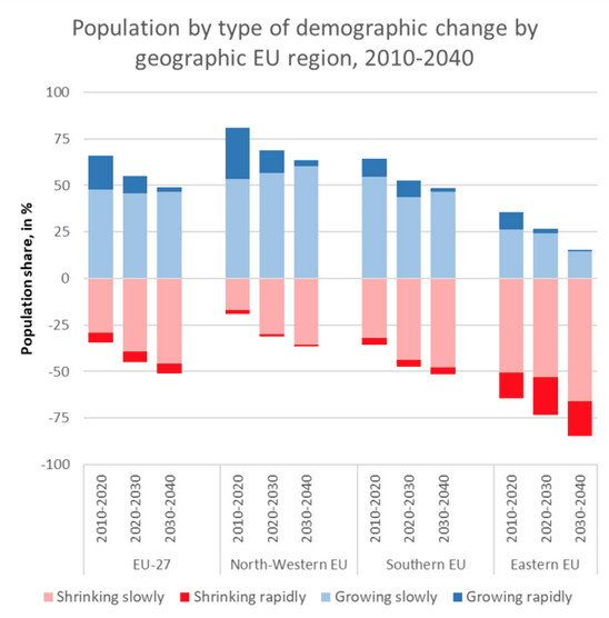 Le proiezioni indicano che entro il 2040 metà della popolazione dell’UE vivrà in una regione in contrazione demografica. Ciò interesserà maggiormente le regioni orientali rispetto a quelle nord-occidentali. Le proiezioni indicano che nel 2040 l’85% della popolazione delle regioni orientali vivrà in una regione che sta perdendo popolazione, rispetto al 37% delle regioni nord-occidentali.