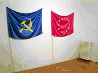 Un altro progetto ancora riguarda la funzione di condizionamento e indottrinamento culturale delle bandiere. Mi racconta l’artista che l’idea di I do not know what Union I want to belong to any more gli è venuta quando si è recato all’ufficio dell’anagrafe per registrare la nascita del figlio e si è sorpreso a trovare, incombente sull’impiegato dietro lo sportello, un enorme stendardo blu dell’Unione Europea nello stesso posto dove fino a qualche anno prima, pendeva la bandiera rossa del partito comunista. Anche quando ci si sposa in Comune, mi dice, il pubblico ufficiale sta tra la bandiera della Romania e quella europea, rapido sostituito del drappo scarlatto prima onnipresente. La proposta di Vlad è stata dunque di combinare la bandiera dell’Unione a quella comunista, stagliando il cerchio stellato dei Paesi europei su un fondo rosso e, su campo blu, una falce e martello riportati a rinnovato sventolìo. Idea, un’ottima rivista d’arte contemporanea prodotta a Cluj, nel 2004 ha inserito in un suo numero una bandiera double-face di Vlad, realizzata sul modello di quelle che si appuntano sui panini imbottiti, solo un po’ più in grande: pare che l’omaggio abbia avuto molto successo tra i lettori. Sicuramente polemiche ha invece riscosso l’imbandierata realizzata dall’artista a Bratislava sempre nel 2004, proprio quando da quelle parti passava in visita ufficiale il presidente del Parlamento Europeo Pat Cox (1).