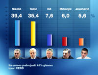 Come già accaduto nel 2004, Nikolic, secondo le proiezioni rese note ieri sera intorno alle ore 21, è risultato il candidato più votato al primo turno, stavolta col 39,4% dei voti, mentre Tadic, con il 35,4% si è di nuovo assestato in seconda posizione. L’attuale presidente però, grazie al suo maggior potenziale di attrazione sugli elettori degli altri candidati, spera chiaramente di poter ripetere il recupero che, nelle elezioni di quattro anni fa, gli permise di superare Nikolic e di vincere in modo piuttosto netto.