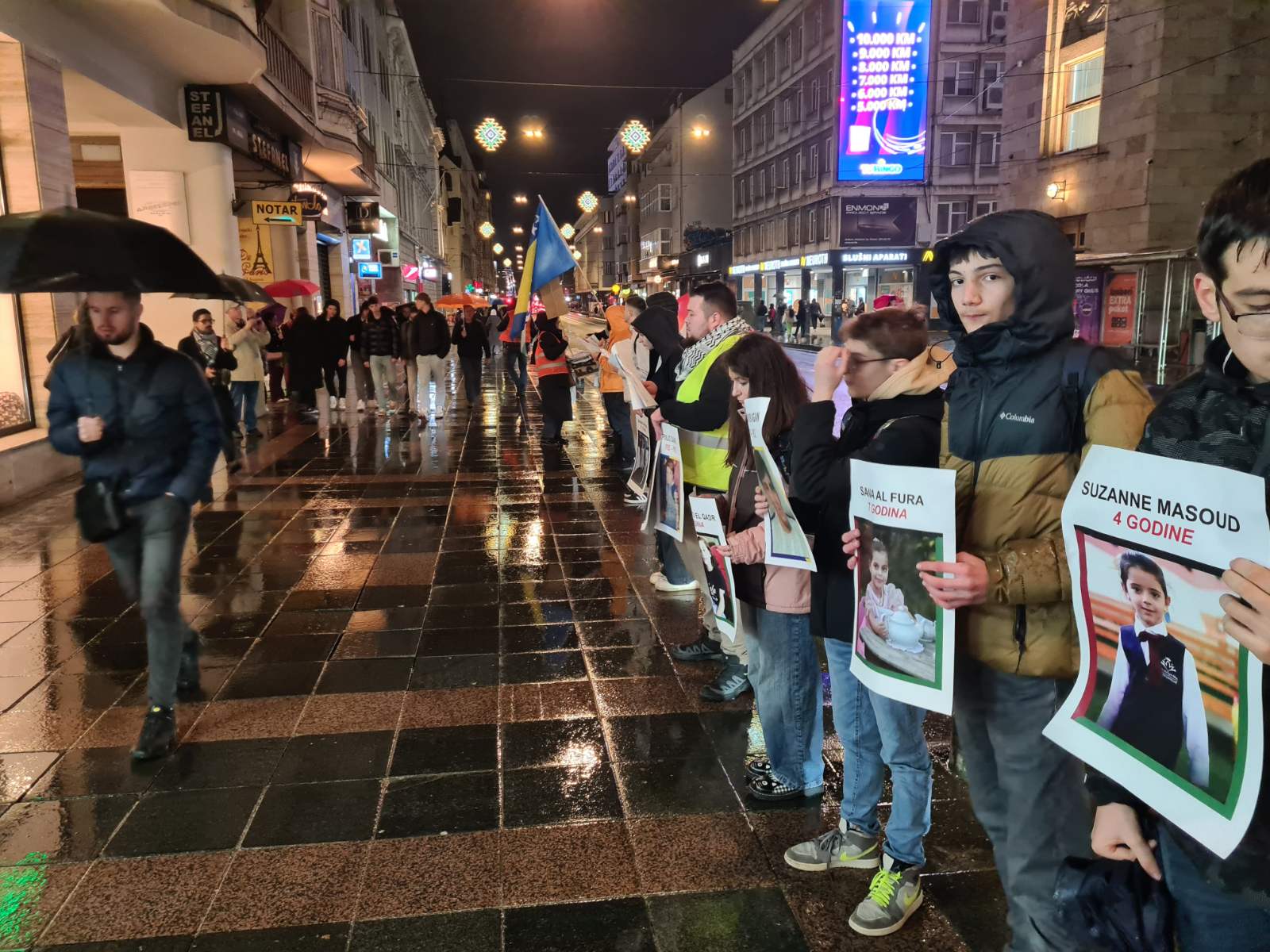 Ljudi su stajali u nizu, sa papirima prekrivenim imena ubijene djece, izgovarajući njihova imena da se ne zaborave. U blizini su se vijorile zastave BiH i Palestine.