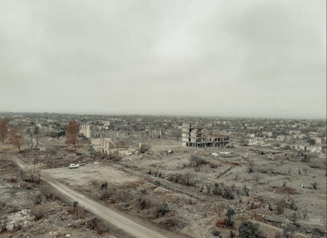 L’unico edificio ad essere rimasto quasi intatto è la grande moschea nella piazza centrale. Attorno soltanto i resti di quella che in epoca sovietica si intuisce potesse essere stata un’elegante cittadina. Oggi tra gli scheletri dei palazzi abbandonati e distrutti ci sono pericolosi campi minati e si aggirano cani e gatti randagi. I soldati azerbaijani sono in questo momento impegnati a disinnescare le mine che rendono la zona impraticabile. Già cinque persone sono morte calpestando delle mine da quando è stata dichiarata una tregua il 10 novembre che per ora ha posto fine alle ostilità. I militari azerbaijani sostengono che l’opera di bonifica del territorio potrebbe durare anche anni perché non è ancora chiaro per quanto si estenda l’area minata.