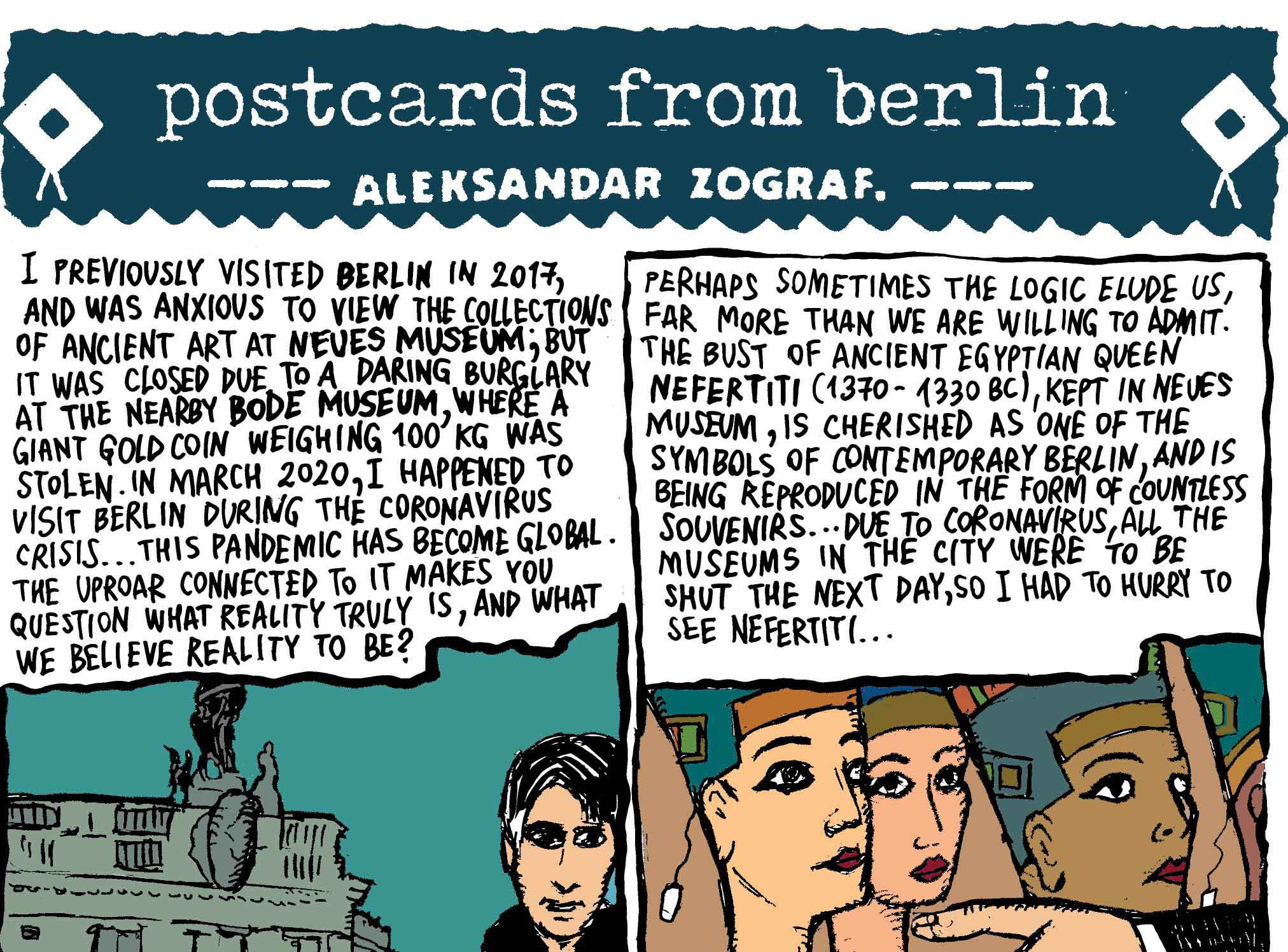 A Berlino l’atmosfera era piuttosto rilassata. Nonostante tutti seguissero le notizie sul coronavirus, solo in pochi indossavano la mascherina. Forse non c’era tanta gente come prima, ma tutto funzionava come al solito. Poi all’improvviso è giunta la notizia che i musei a Berlino dovevano chiudere i battenti al pubblico. Era l’ultimo giorno in cui potevo visitare una mostra dei miei fumetti, organizzata nell’ambito di un’iniziativa intitolata “comiXconnection”, un evento ben ideato dedicato ai fumettisti di vari paesi, già presentato in venti città del sud-est Europa e in Germania.