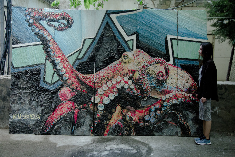 Dato che sono proprio gli abitanti del mare a dover affrontare le maggiori minacce che arrivano dalla plastica, il lavoro più rilevante di Nazrin Musayeva è un’enorme polpo ricreato con rifiuti di plastica. Le sono voluti otto mesi per realizzarlo, quattro per raccogliere i rifiuti, quattro per creare l’opera.