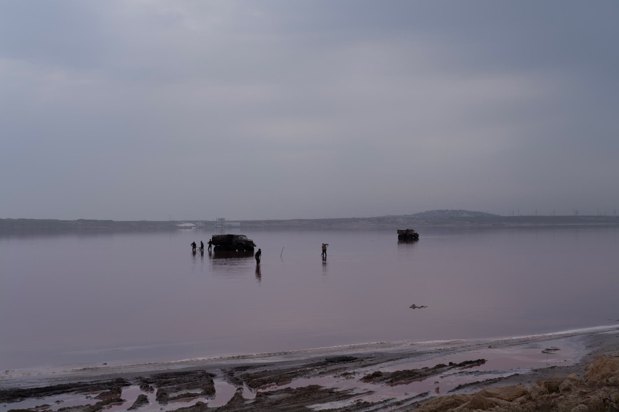 stanno preparando un macchinario per estrarre il sale nel lago – foto di Shahla Abbakirova