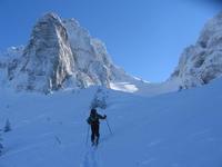 Salendo la neve è sempre più alta, ma è quella “vecchia” rimasta dai mesi dell’inverno e mai sciolta. All’altezza di oltre 1500 metri, usciamo dalla foresta e ci appare davanti una vallata. Il posto si chiama Kozija Luka, a destra c’è il rifugio “Josip Sigmun”.