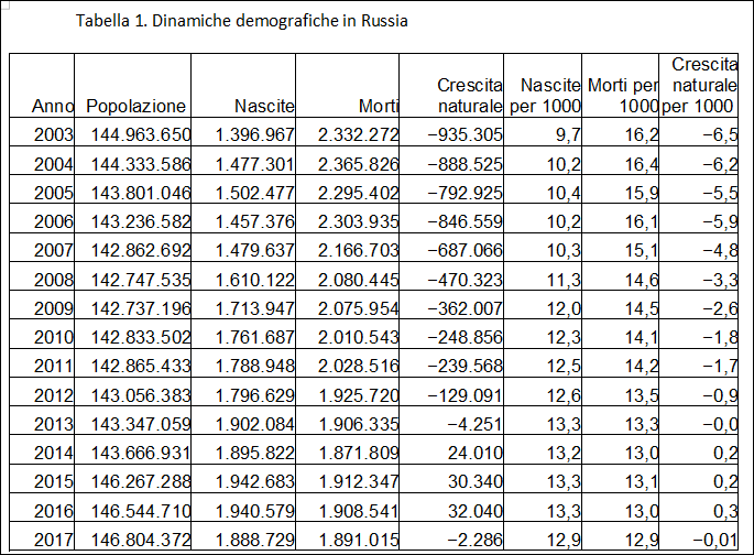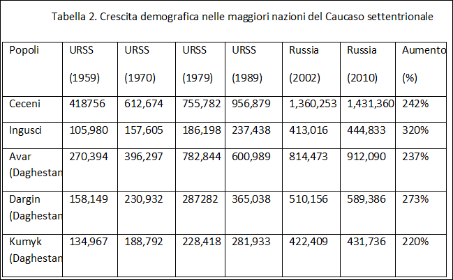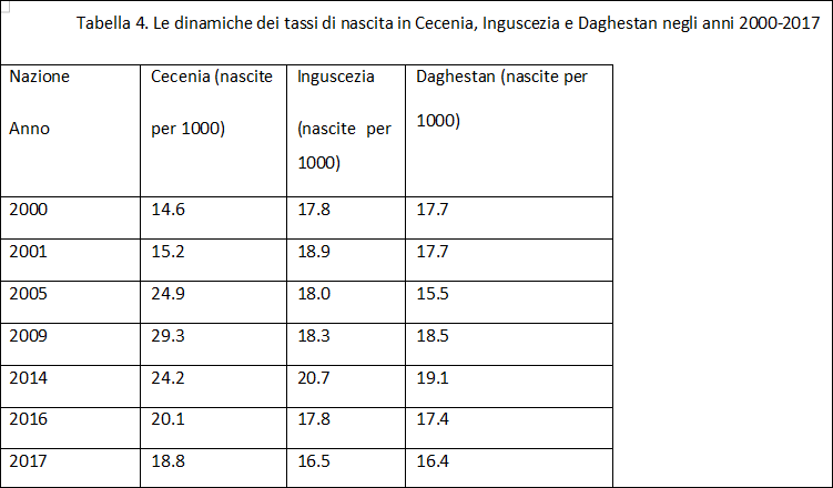 Nel contesto di declino generale o crescita quasi zero della popolazione in Russia (si veda tabella 1), sono poche le regioni che mostrano la tendenza opposta. Tra queste vi sono le repubbliche politicamente instabili del Caucaso settentrionale: Cecenia, Inguscezia e Daghestan.