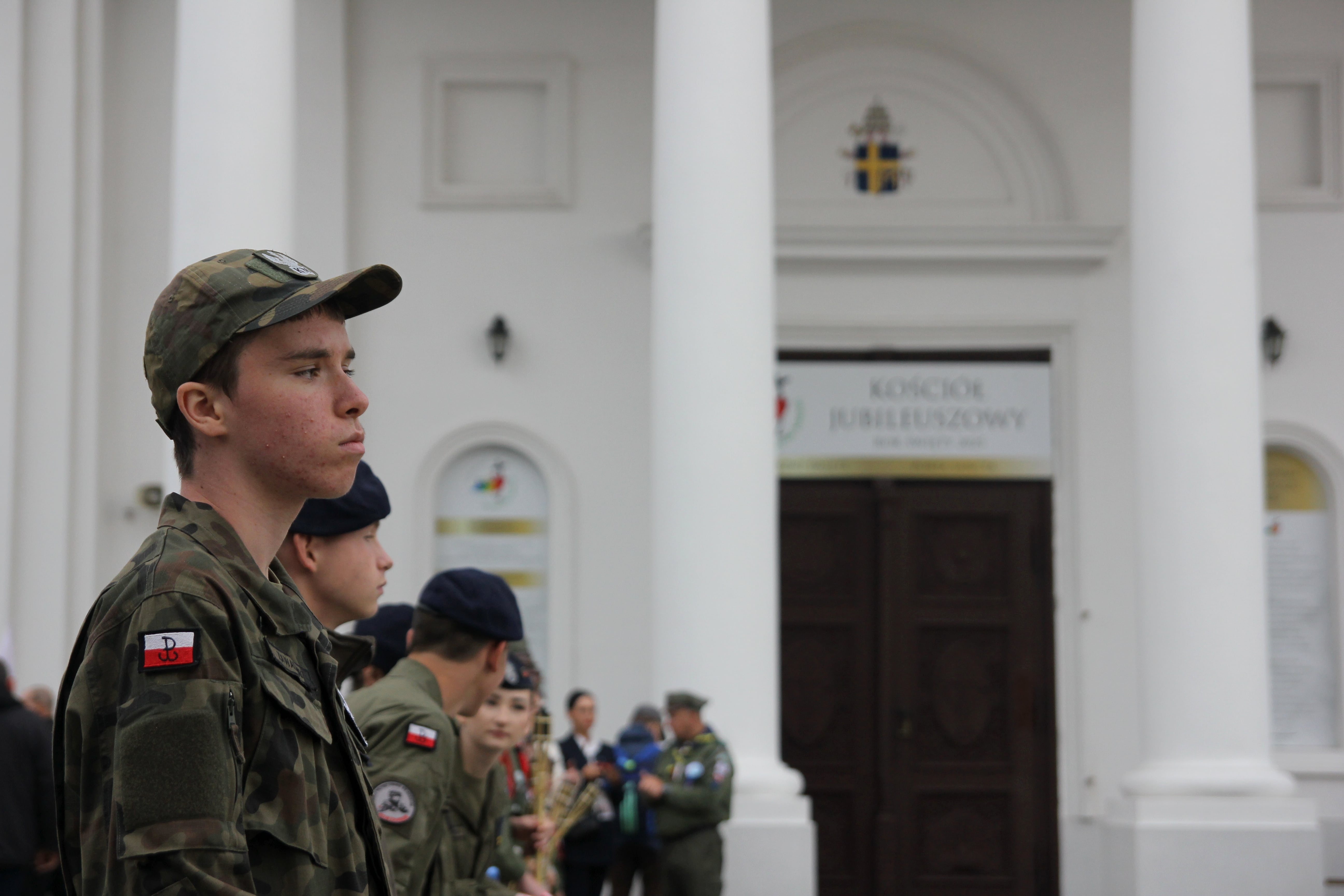 Nella prima serata di un 11 luglio particolarmente uggioso, lo spazio antistante alla cattedrale sembra una piazza d’armi. Assieme ai fedeli raccolti in preghiera sciamano gruppi di ragazzi e ragazze in divisa che presto si dispongono in file ordinate. Alcuni fra gli avventori reggono, fra il contrito e l’orgoglioso, le biancorosse bandiere polacche, mentre un poco più in disparte una coppia di automobili nere ricordano che per l’occasione è presente anche il presidente eletto della Polonia, Karol Nawrocki.
