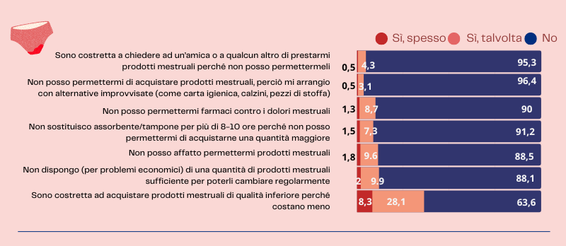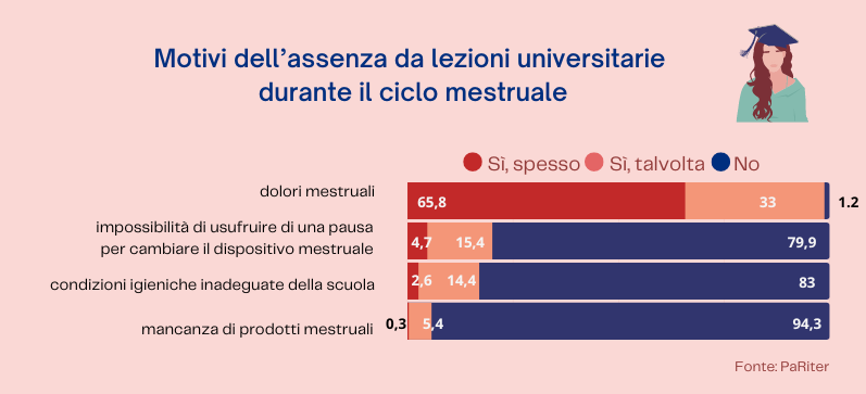 Dalla ricerca condotta dall’associazione PaRiter è inoltre emerso che la povertà mestruale incide anche sull’accesso delle ragazze e delle donne all’istruzione e al lavoro. Il 60% delle ragazze intervistate ha affermato di aver più volte saltato la scuola a causa delle mestruazioni, di queste l’8,7% ha citato la mancanza di accesso a prodotti mestruali come motivo principale alla base dell’impossibilità di frequentare regolarmente la scuola durante il ciclo mestruale. Situazione simile anche per quanto riguarda le studentesse universitarie: il 68,1% delle studentesse almeno una volta ha saltato le lezioni a causa del ciclo, di queste il 5,7% denuncia le difficoltà nell’accedere a prodotti mestruali. Quanto alle donne che lavorano, il 28,6% delle lavoratrici intervistate almeno una volta è stato impossibilitato a recarsi al lavoro durante il ciclo mestruale, a volte proprio per mancanza di accesso a prodotti per l’igiene mestruale (3,4%).
