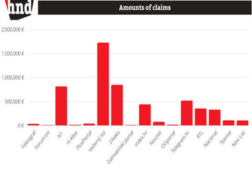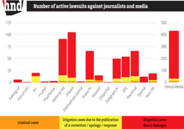 Dopo i risultati dei sondaggi dello scorso anno, Hanza media (editore di Jutarnji list, Globus, Slobodna Dalmacija…) ha ancora una volta il maggior numero di cause legali tra gli editori: 421 procedimenti civili e 11 procedimenti penali. Il secondo posto per numero di cause spetta a Styria, che solo per Večernji list e 24sata conta 190 procedimenti civili e 6 penali. Il procedimento più lungo è attivo da 33 anni ed è condotto contro Večernji list.