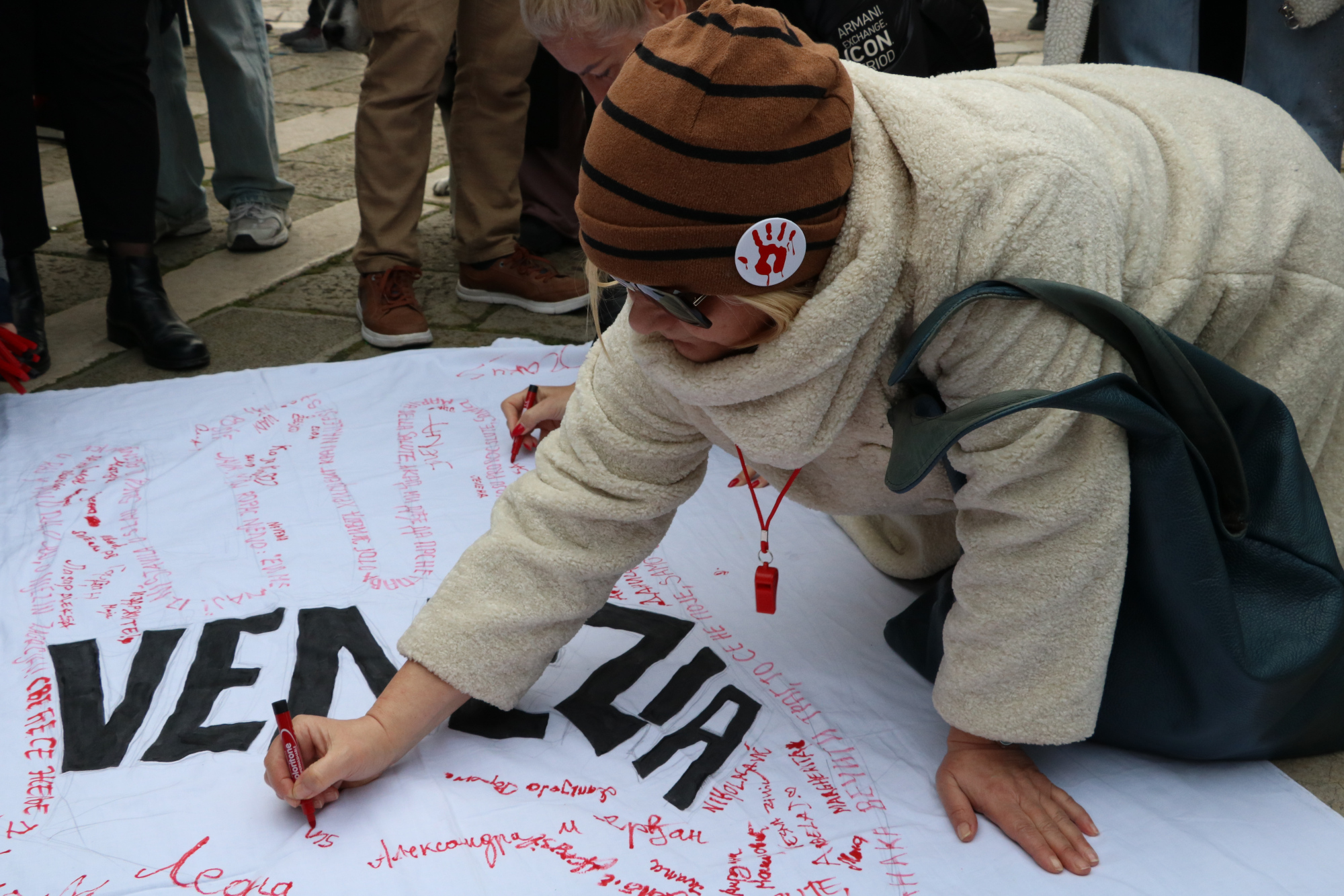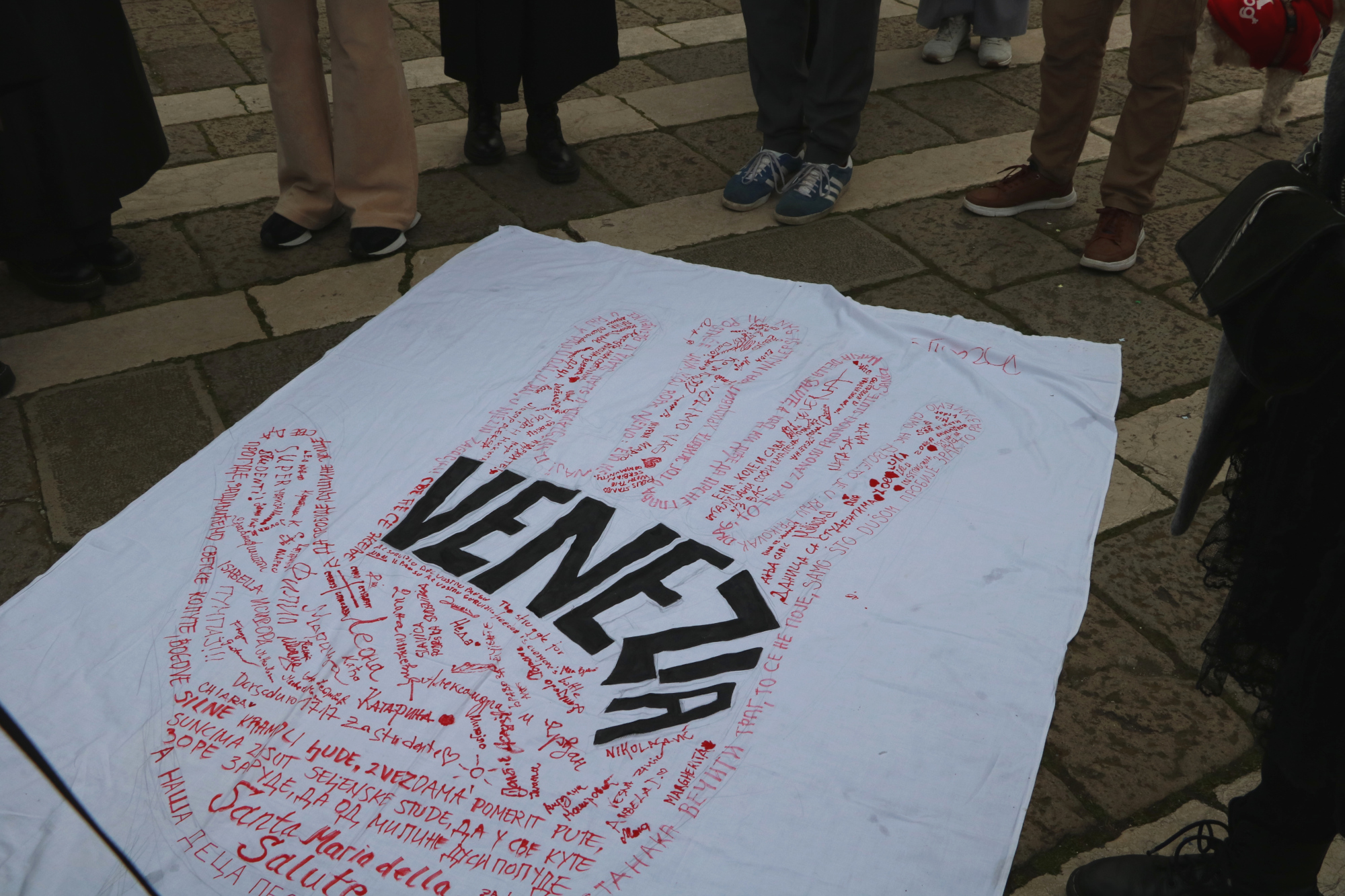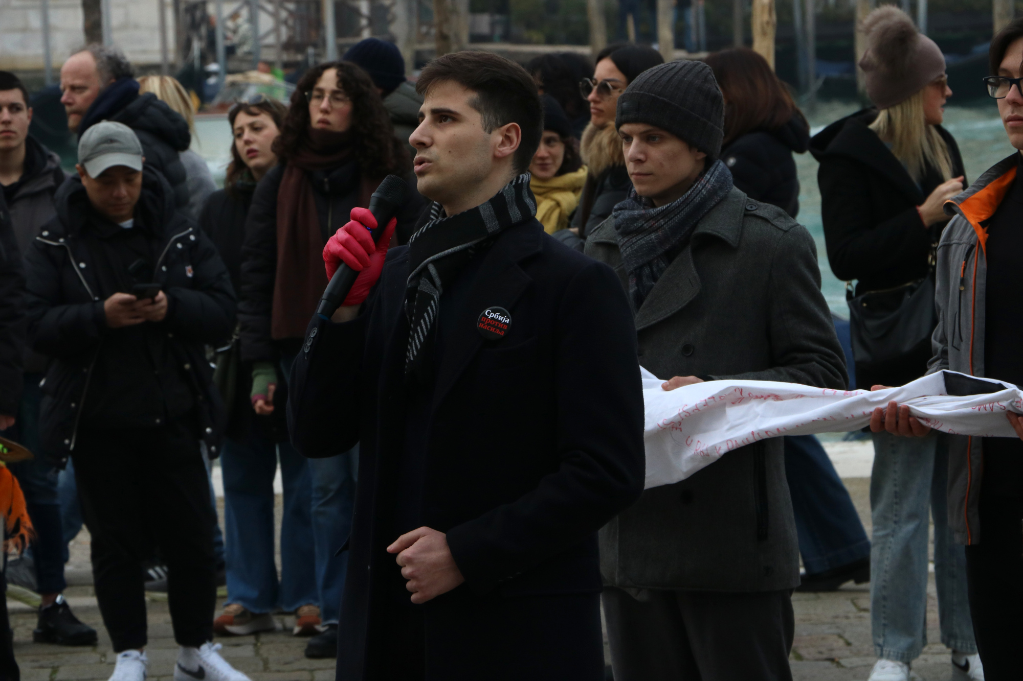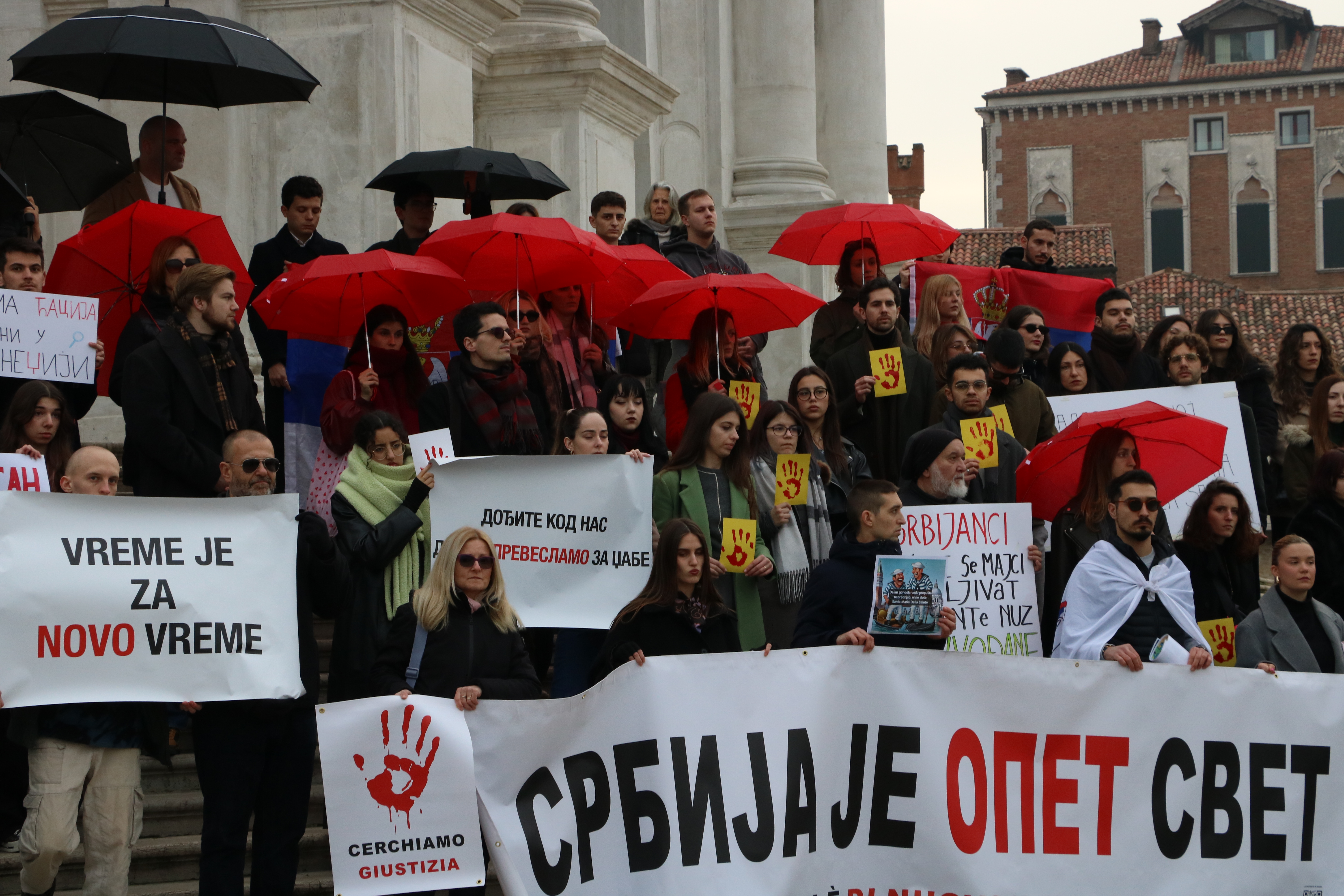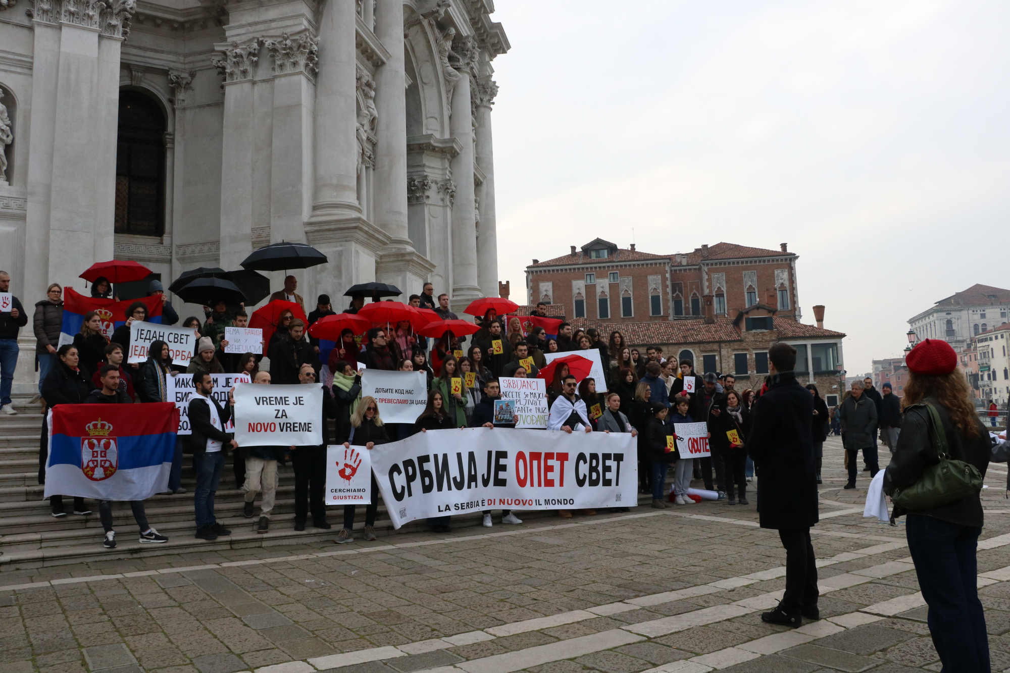 “Cari amici, studenti, membri della diaspora, e tutti coloro che credono nella giustizia, oggi ci riuniamo qui a Venezia, città che unisce passato e presente, simbolo di cultura e di lotta per la libertà. Grazie per la vostra presenza qui oggi. Dimostra quanto il confine è solo una linea su una mappa mentre le idee di giustizia, bontà e libertà superano qualsiasi confine.” Con queste parole Srdan Vlahović, studente che frequenta l’Università Ca’ Foscari, ha dato il via alla pacifica manifestazione organizzata lo scorso 22 febbraio davanti alla Basilica di Santa Maria della Salute.