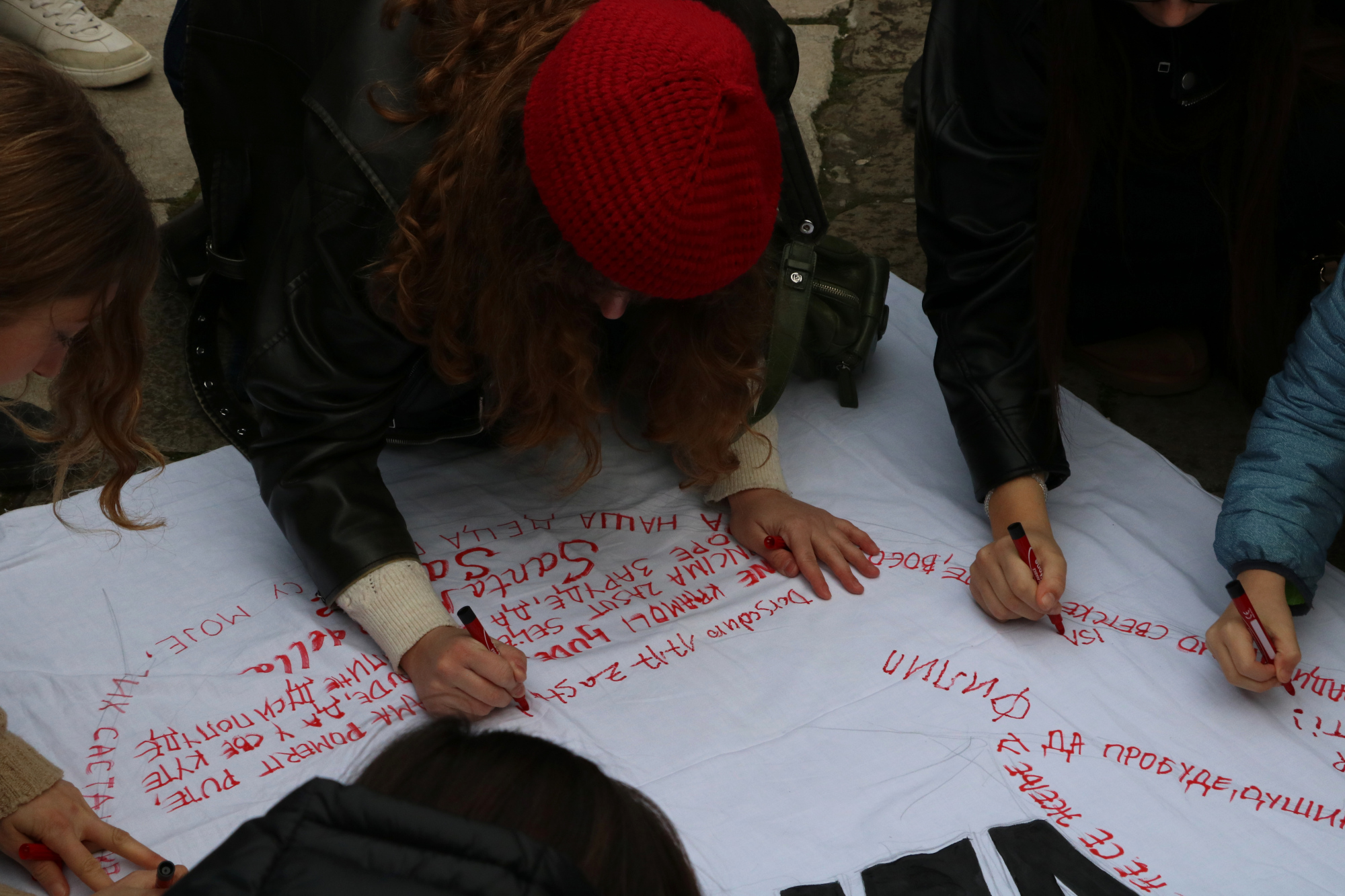 I presenti hanno firmato e scritto frasi su un lenzuolo bianco, su idea della giovanissima Malena Janković, all’interno di una mano dipinta di rosso, diventata simbolo delle proteste in Serbia.