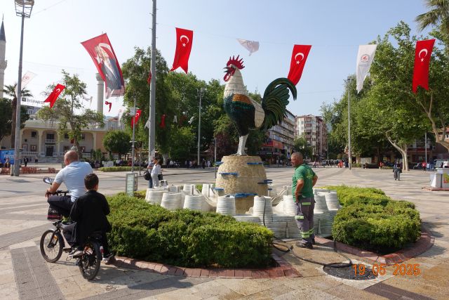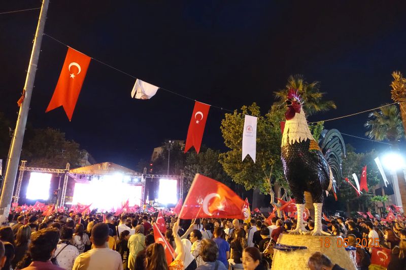 Oggi ovviamente il rumore del traffico e il canto modulato e amplificato dagli altoparlanti del muezzin, che dalla moschea grande della piazza scandisce il tempo della preghiera islamica, sovrasterebbero qualsiasi ‘chicchirchì’ del gallo frigio. E tuttavia è da lì, sotto quel rilucente uccello dalle dimensioni ben più grandi che in natura (dove, dicono, vanta anche la cresta più imponente tra i suoi simili del pianeta), che ho visto svolgersi gli eventi pubblici di una delle settimane festive di rilievo della Turchia.