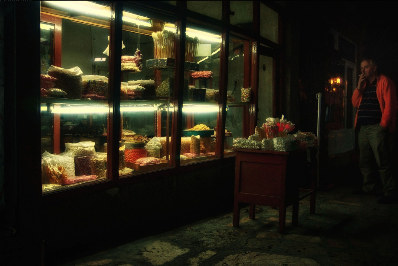 Un negozio di dolciumi artigianali, a Skopje, Macedonia. Quando il tempo sospende il suo fluire e i colori riempiono pacati le vetrine. Foto di Davide Palmisano