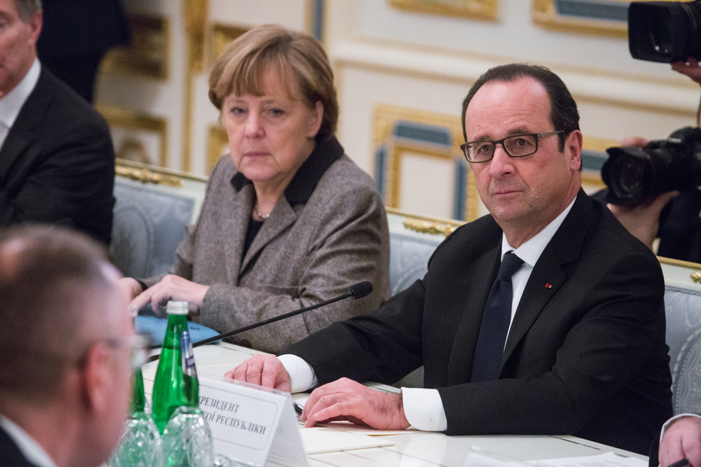 Kiyv, Ucraina - 5 febbraio 2015: il presidente francese Francois Hollande e la cancelliera tedesca Angela Merkel