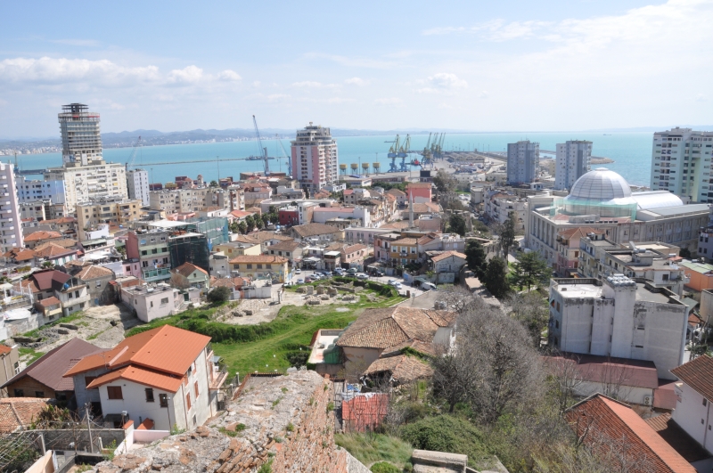 ‘Abbracciare con lo sguardo’ l’antica Epidamno, che fu appunto una colonia greca fondata tra il 628 e il 624 a.C., risulta per me più difficile del previsto. Pur se la torre mi appariva vicina in linea d’aria rispetto all’anfiteatro, non vi è una strada diretta o una scalinata che vi salga. Le casette cresciute disordinatamente lungo le pendici della rocca hanno privatizzato ogni accesso, e solo dopo alcuni tentativi infruttuosi trovo chi mi indica la strada giusta: una via asfaltata, che con un amplissimo curvone in salita arriva a prendere poi il torrione alle spalle. Da una passante che mi dà l’informazione vengo affidato ad una combriccola di giovani locali che proprio lassù si stanno recando: così almeno mi fanno capire in uno stentato inglese. La salita è erta, a riprova di quelle etimologie che davano il nome Durrhachium collegato al greco antico rhachìa, ‘litorale pietroso, scoglioso’, quindi alla ‘rachide’: una sporgenza o ‘spina dorsale’. Arrivati alla curva da cui poi svoltiamo all’indietro per avvicinarci al ciglio dell’altura, e lì accedere al nostro belvedere, mi accorgo che la strada prosegue dal lato opposto, diritta verso un altro punto spettacolare del promontorio: quello su cui troneggia la elegante dimora liberty fatta costruire da re Zog, colui che dovette cedere l’Albania agli italiani nel 1939.