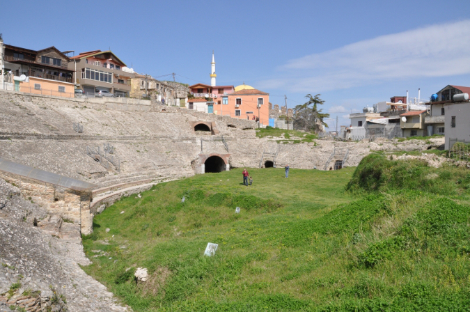 Il centro cittadino si trova ai piedi della propaggine meridionale del promontorio su cui Durazzo fu costruita: un pendio piuttosto ripido, che i Romani sfruttarono per erigervi quello che fu, secondo alcuni, il più grande anfiteatro dei Balcani (l’asse maggiore della sua ellisse è di 120 metri). E’ questo ‘Colosseo’ albanese che per prima cosa mi reco a visitare seguendo i marciapiedi della odierna Egnazia e poi tagliando per la piazza del Municipio, lastricata in pietra e ingentilita da moderne fontane. A differenza degli altri anfiteatri che conosciamo in Italia o nelle remote province dell’impero, questo era soltanto in parte elevato in muratura, poiché quasi tutto il suo emiciclo settentrionale si addossava al pendio roccioso del promontorio. Oggi è come un’oasi di pace in mezzo all’attivissima città, agevolmente visitabile e aperto anche nei giorni festivi, quale è quello in cui vi arrivo. Anche qui, una sorpresa: le case che pure lo circondano, al contrario di quanto pare di vedere in vecchie foto, non insistono proprio sulle sue gradinate, ed anzi le coronano in modo tutto sommato gradevole. Invece, quello che è quasi completamente andato perduto è il suo circuito in alzato, quello meridionale, dalla parte che digrada verso il mare.