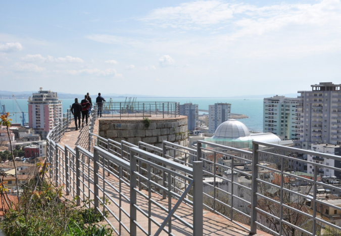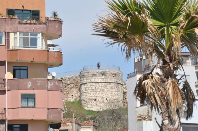 ‘Abbracciare con lo sguardo’ l’antica Epidamno, che fu appunto una colonia greca fondata tra il 628 e il 624 a.C., risulta per me più difficile del previsto. Pur se la torre mi appariva vicina in linea d’aria rispetto all’anfiteatro, non vi è una strada diretta o una scalinata che vi salga. Le casette cresciute disordinatamente lungo le pendici della rocca hanno privatizzato ogni accesso, e solo dopo alcuni tentativi infruttuosi trovo chi mi indica la strada giusta: una via asfaltata, che con un amplissimo curvone in salita arriva a prendere poi il torrione alle spalle. Da una passante che mi dà l’informazione vengo affidato ad una combriccola di giovani locali che proprio lassù si stanno recando: così almeno mi fanno capire in uno stentato inglese. La salita è erta, a riprova di quelle etimologie che davano il nome Durrhachium collegato al greco antico rhachìa, ‘litorale pietroso, scoglioso’, quindi alla ‘rachide’: una sporgenza o ‘spina dorsale’. Arrivati alla curva da cui poi svoltiamo all’indietro per avvicinarci al ciglio dell’altura, e lì accedere al nostro belvedere, mi accorgo che la strada prosegue dal lato opposto, diritta verso un altro punto spettacolare del promontorio: quello su cui troneggia la elegante dimora liberty fatta costruire da re Zog, colui che dovette cedere l’Albania agli italiani nel 1939.