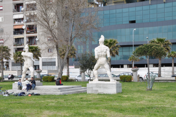 Due grossi guerrieri in cemento che si affrontano in duello lungo la passeggiata, frutto di chissà quale rievocazione storica delle imprese degli Illiri, ospitano sul loro piedistallo una famigliola intenda ad un pic-nic. Venditori di palloncini colorati, aquiloni tesi all’aria, automobiline elettriche per bambini e tanti gruppi di adolescenti intenti allo ‘struscio’ dei giorni festivi sfilano davanti ai caffè e ai ristoranti del lungomare, che osano esporre all’esterno i primi tavolini di una stagione che certo verrà.