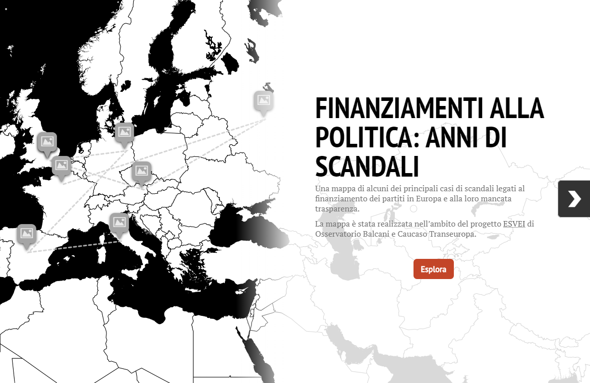 Una mappa interattiva di alcuni dei principali scandali legati al finanziamento dei partiti e della campagne elettorali in Europa. In alcuni casi i finanziamenti (o presunti tali) sono illegali in sé, in altri casi lo scandalo deriva dalla mancanza di trasparenza.