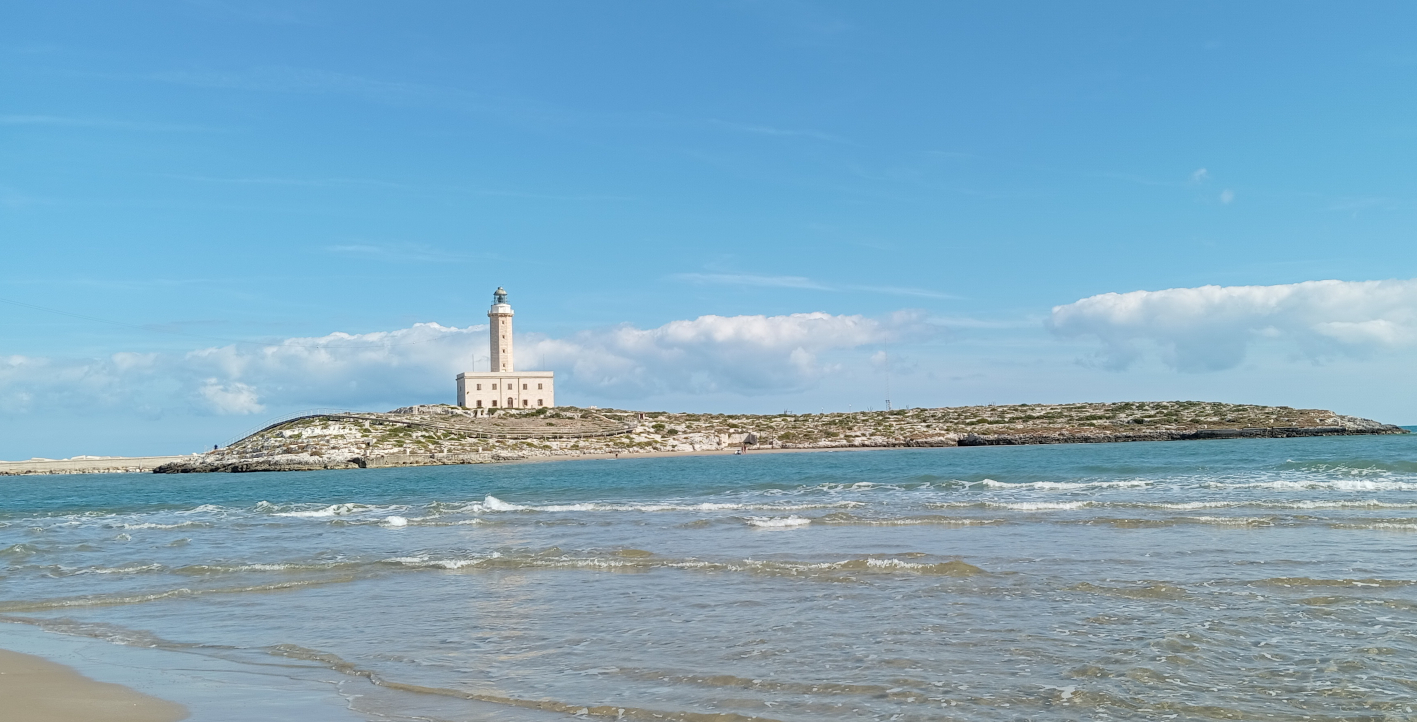 Dopo aver fatto due chiacchiere con un pescatore poetico a cui le albe interessano più delle orate, le nuvole più dei branzini o così mi dice ridendo sotto baffoni turcheschi, seguendo le sue indicazioni, vado al tombolo che permette d’andare a piedi fino all’isola. Quindici minuti a piedi sul lungomare per arrivare a Punta Santa Croce, da poco risistemata.