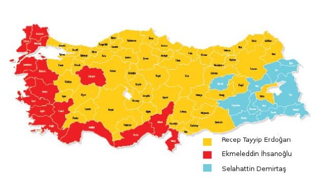Fa una curiosa impressione osservare, sui giornali turchi, la distribuzione territoriale dei voti ottenuti dai tre candidati nelle recenti elezioni presidenziali. La mappa del Paese viene suddivisa nelle sue 81 province (iller), e la colorazione di ciascuna varia in base al candidato che vi ha riportato la vittoria. La testata Milliyet, ad esempio, colora in rosso quelle conquistate dal rappresentante dell’opposizione, Ekmeleddin İhsanoĝlu, in giallo quelle attribuite al vincitore, il capo del Governo uscente Recep Tayyip Erdoĝan, e in azzurro quelle del terzo arrivato, il capo del partito curdo HDP Selahattin Demirtaş. E’ un tipo di rappresentazione del voto assai consueta in tutte le elezioni del mondo: nel caso turco, tuttavia, le macchie di colore che ne risultano sono tanto singolari da evidenziare realtà che le sole semplici cifre delle percentuali raggiunte dai tre candidati (rispettivamente il 38,5, il 51,7 e il 9,8) non lascerebbero immaginare.