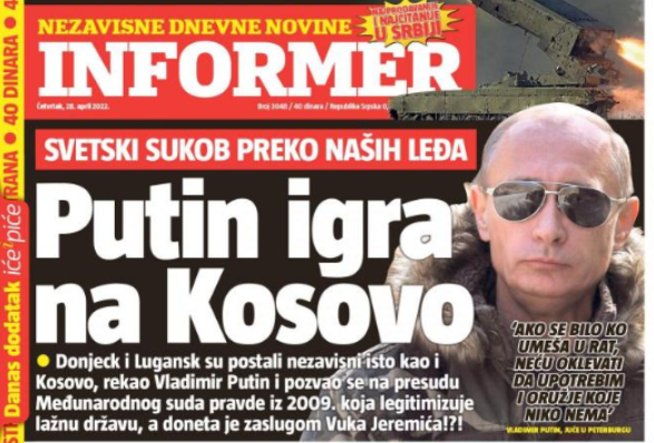 Il caporedattore di Informer non ha cambiato la sua opinione su Putin nemmeno quando quest’ultimo ha citato il caso del Kosovo per giustificare il riconoscimento dell’indipendenza del Donbass da parte di Mosca. Informer si è limitato a constatare con toni blandi che “Putin gioca la carta del Kosovo” e che “lo scontro tra le potenze mondiali si gioca sulle nostre spalle”, addossando però tutte le colpe a Vuk Jeremić, uno dei leader dell’opposizione serba. Così la figura di Putin è rimasta “incorrotta” e l’articolo in questione, pubblicato in prima pagina, è stato accompagnato da una foto del presidente russo che lo ritrae con gli occhiali da sole e un’espressione seria, tanto che sembra un eroe dei film d’azione.