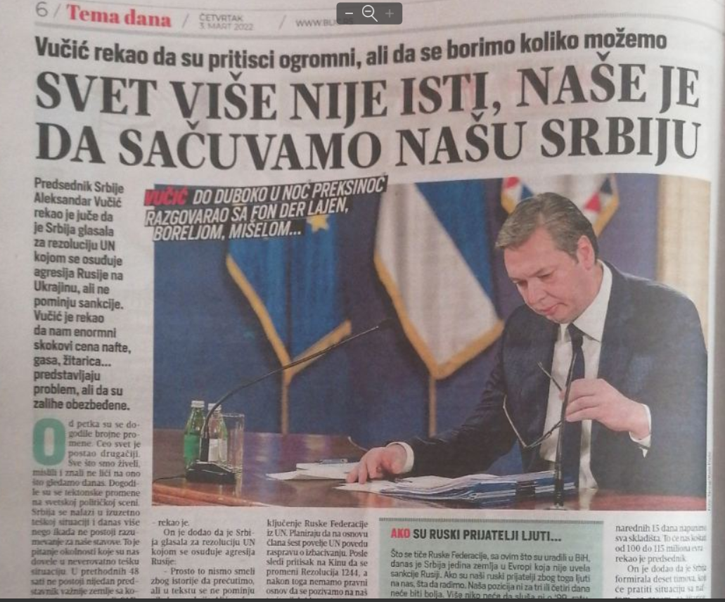Il numero di Blic con la copertina sopra descritta è uscito all’indomani dell’approvazione della risoluzione dell’Onu che condannava l’aggressione russa all’Ucraina. Blic ha evidentemente ritenuto necessario giustificare agli occhi degli elettori di Vučić la decisione della Serbia di appoggiare la risoluzione in questione.