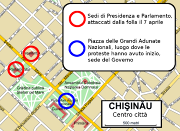 Il giorno seguente, il 7 aprile, una manifestazione che ha coinvolto molte più persone ha avuto inizio alle 10 del mattino in Piazza delle Grandi Adunate Nazionali, situata nel centro di Chişinău di fronte al palazzo del governo. Dopo un po’ di tempo, i dimostranti si sono divisi in due gruppi; uno è rimasto in questa piazza, mentre l’altro ha iniziato a dirigersi verso gli edifici che ospitano il Parlamento e la Presidenza della repubblica, situati l’uno di fronte all’altro in una delle strade centrali della città, a qualche centinaio di metri di distanza dalla piazza.