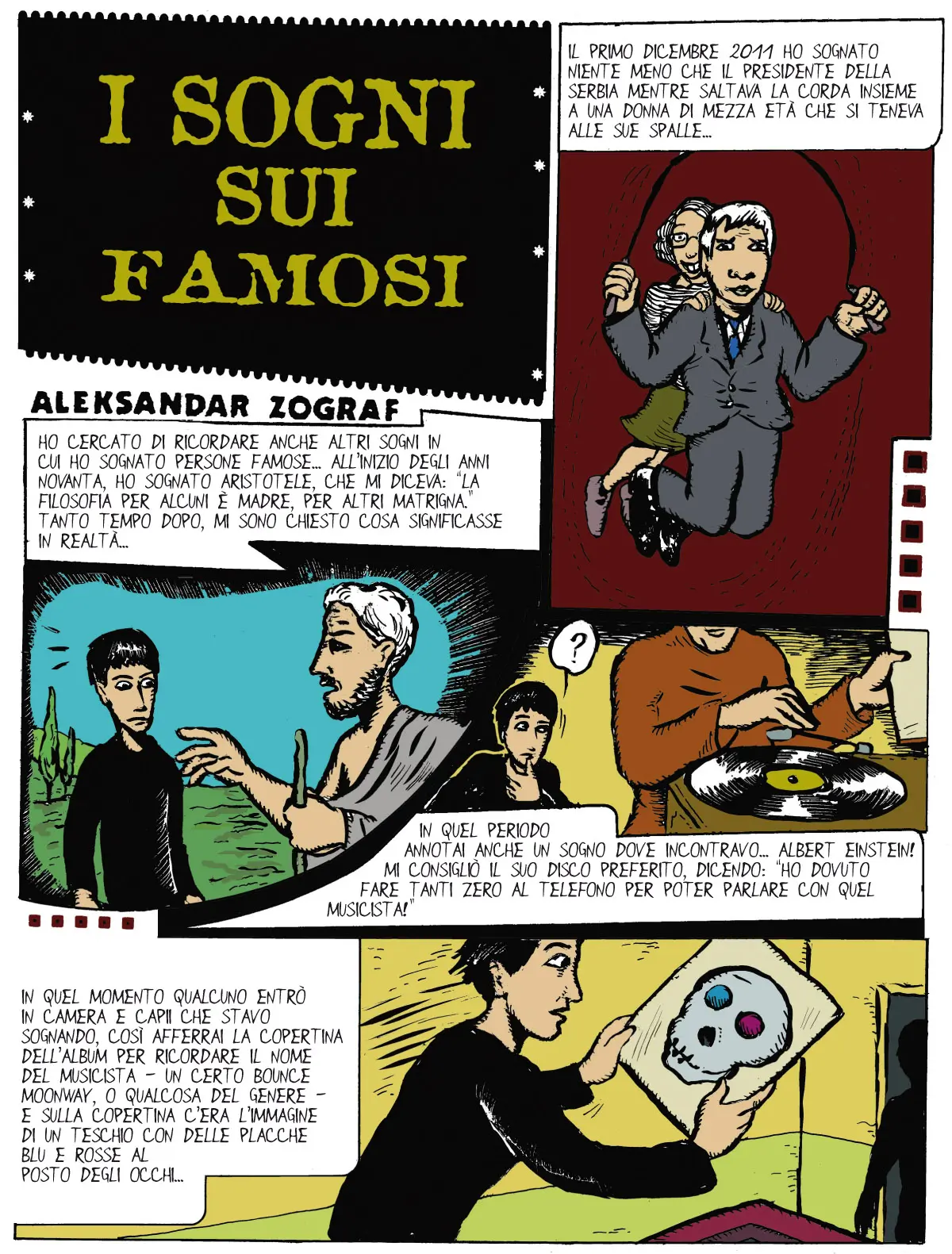 Aleksandar Zograf, pseudonimo di Saša Rakezić, è nato nel 1963 a Pančevo (Vojvodina, Serbia). Giornalista musicale e disegnatore di fumetti, è autore di numerosi lavori pubblicati in tutto il mondo. Tra questi: Life Under Sanctions, Psychonaut, Dream Watcher e Bulletins from Serbia. In Italia si afferma con Lettere dalla Serbia, cronaca quotidiana dei bombardamenti della NATO (PuntoZero, 1999), Psiconauta (1999) e Saluti dalla Serbia (2001). Per la casa editrice Black Velvet pubblica successivamente (C’è) Vita nei Balcani?, seguito di Saluti dalla Serbia e i volumi Appunti – Un anno con Aleksandar Zograf (volumi 1 e 2), Abramacabra (su testi di Francesca Faruolo ed Emanuele del Medico).
