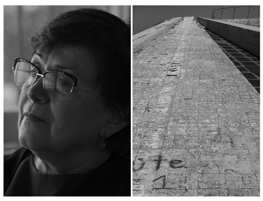 Nevila Nika e un dettaglio della Piramide, il famoso, faraonico mausoleo che domina il centro di Tirana. Una tomba regale costruita per custodire il corpo del dittatore e che oggi è un monumento in rovina - Camilla de Maffei