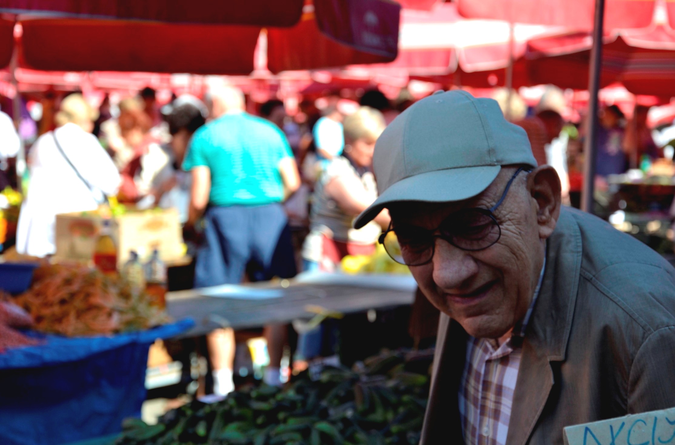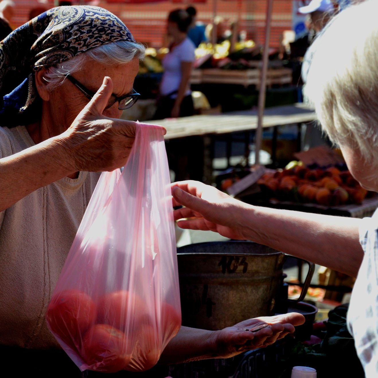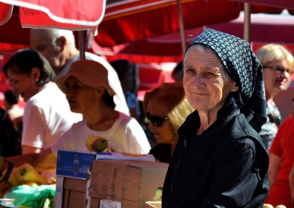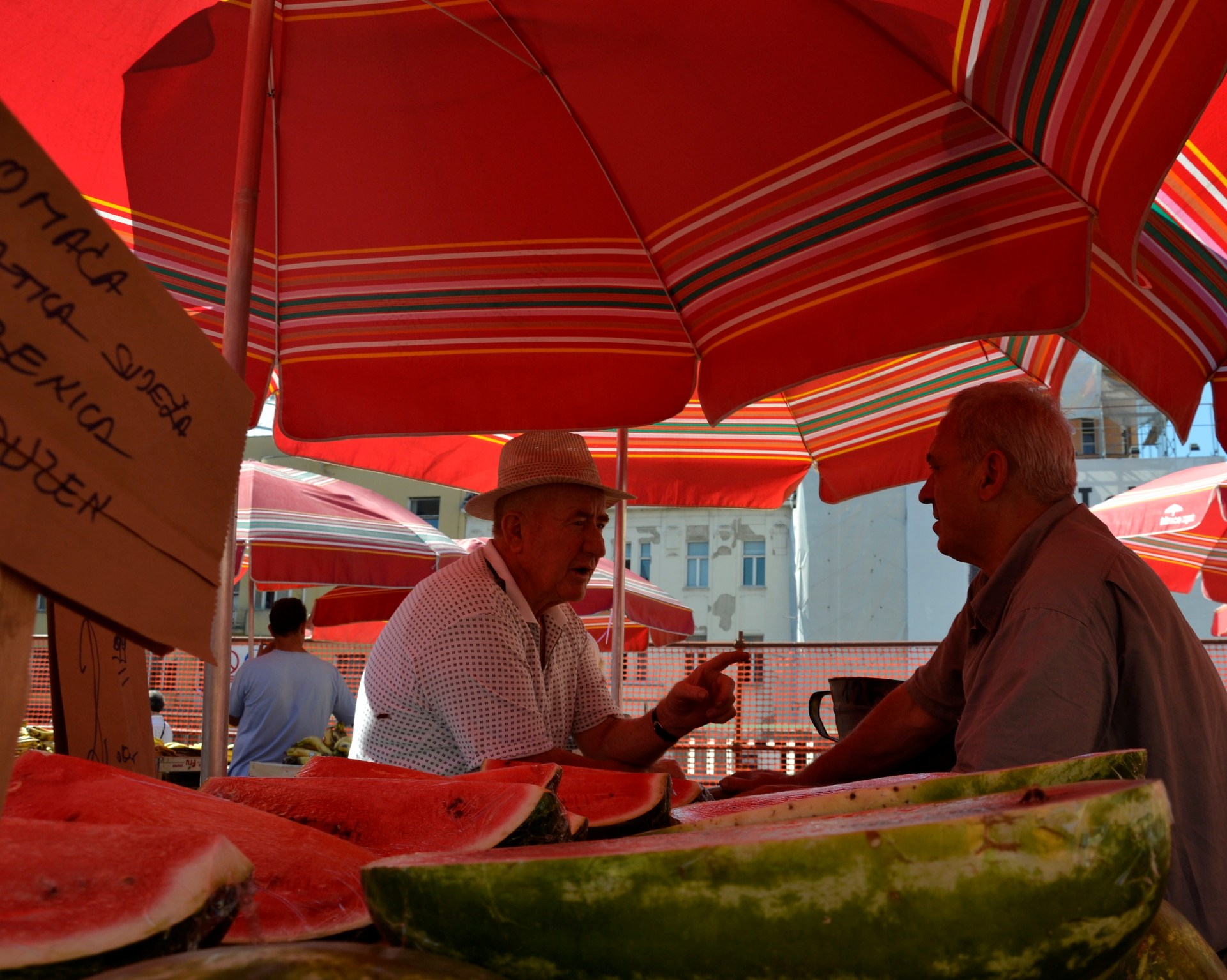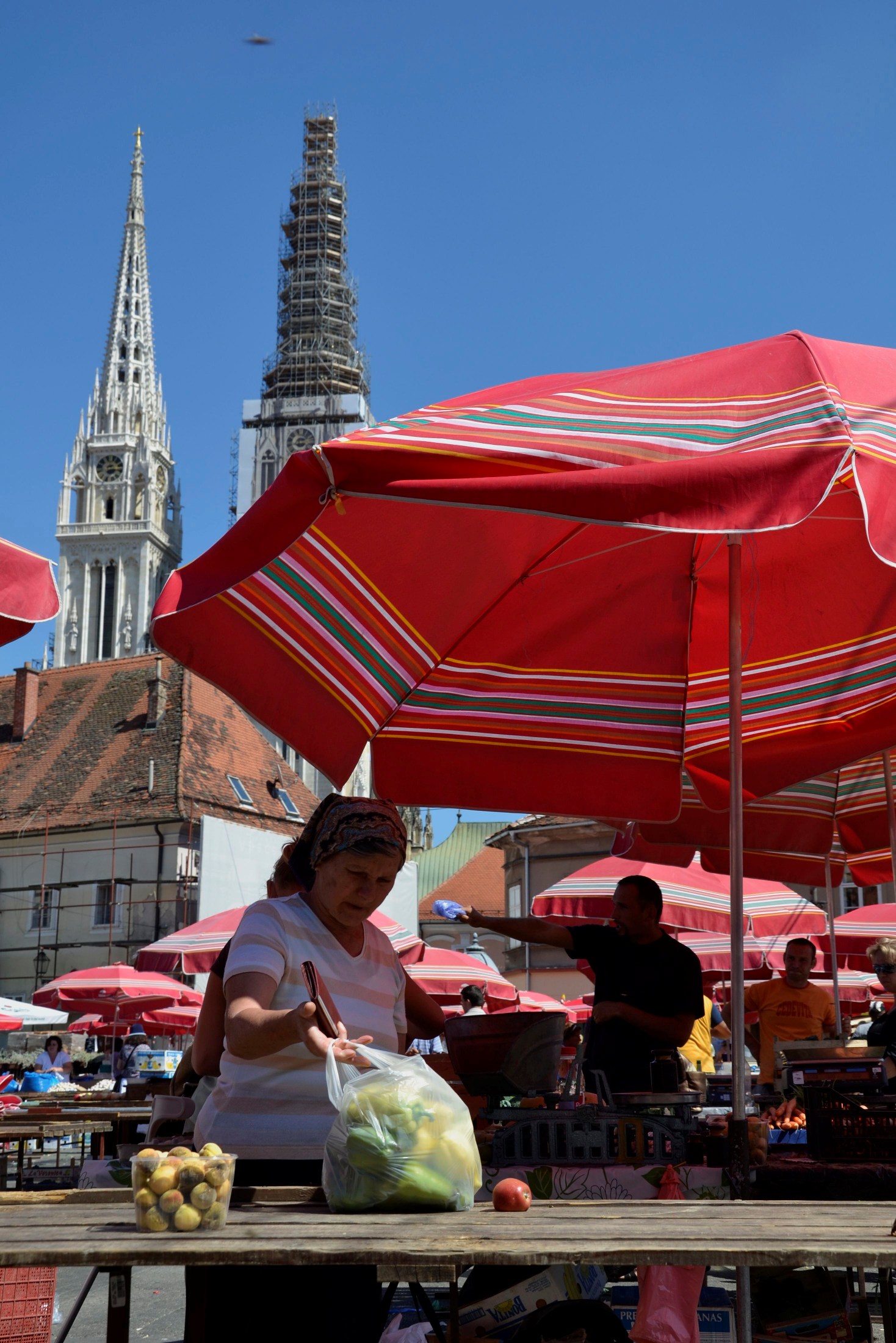 Volti e colori del mercato di Dolac. Il colore rosso degli ombrelloni domina la piazza e fa da sfondo a contadini che armeggiano con le vecchie bilance a piatti. Una galleria fotografica di Andrea Mella