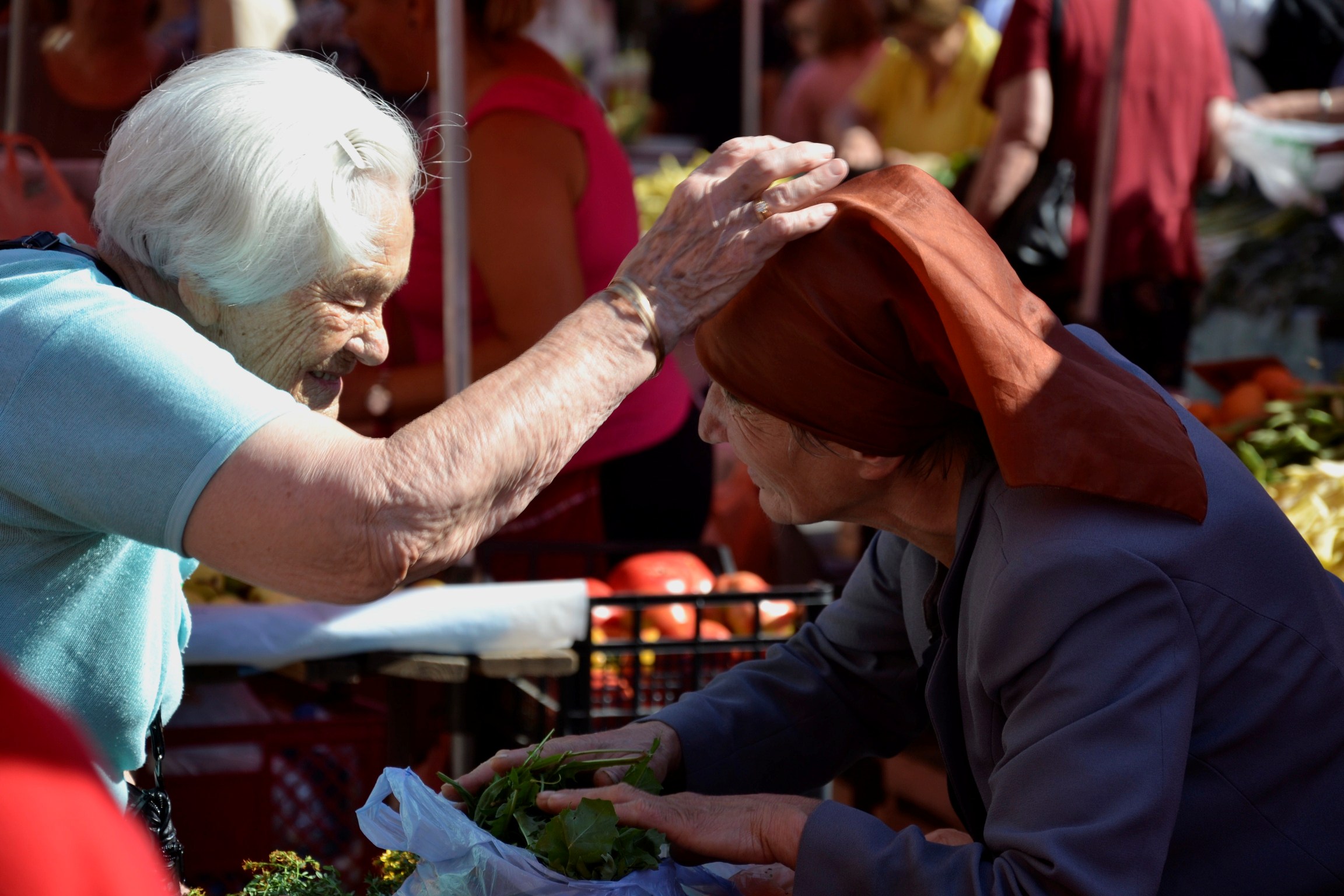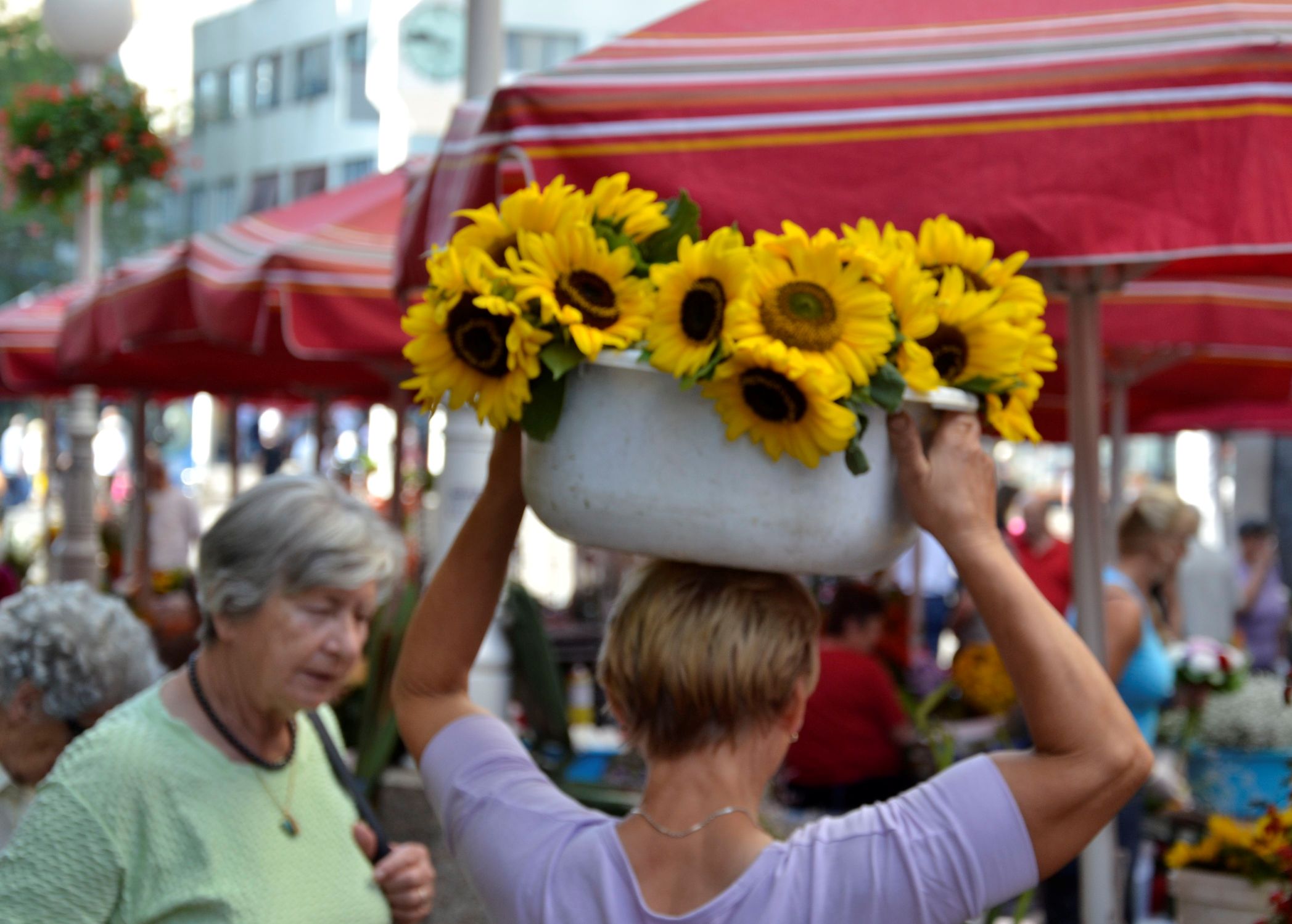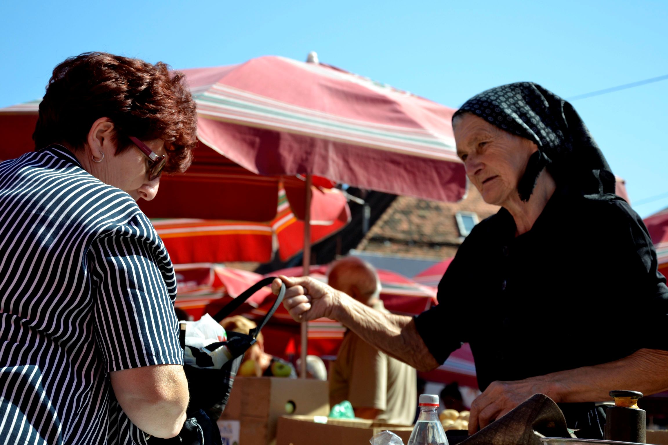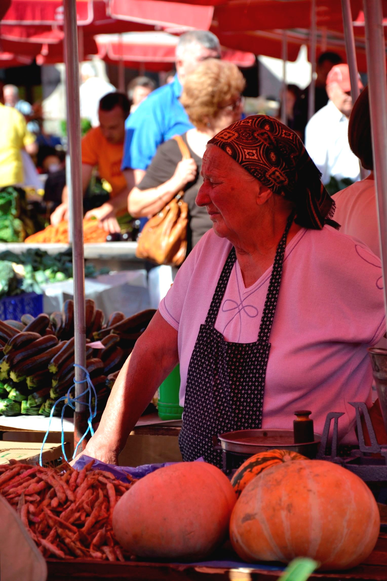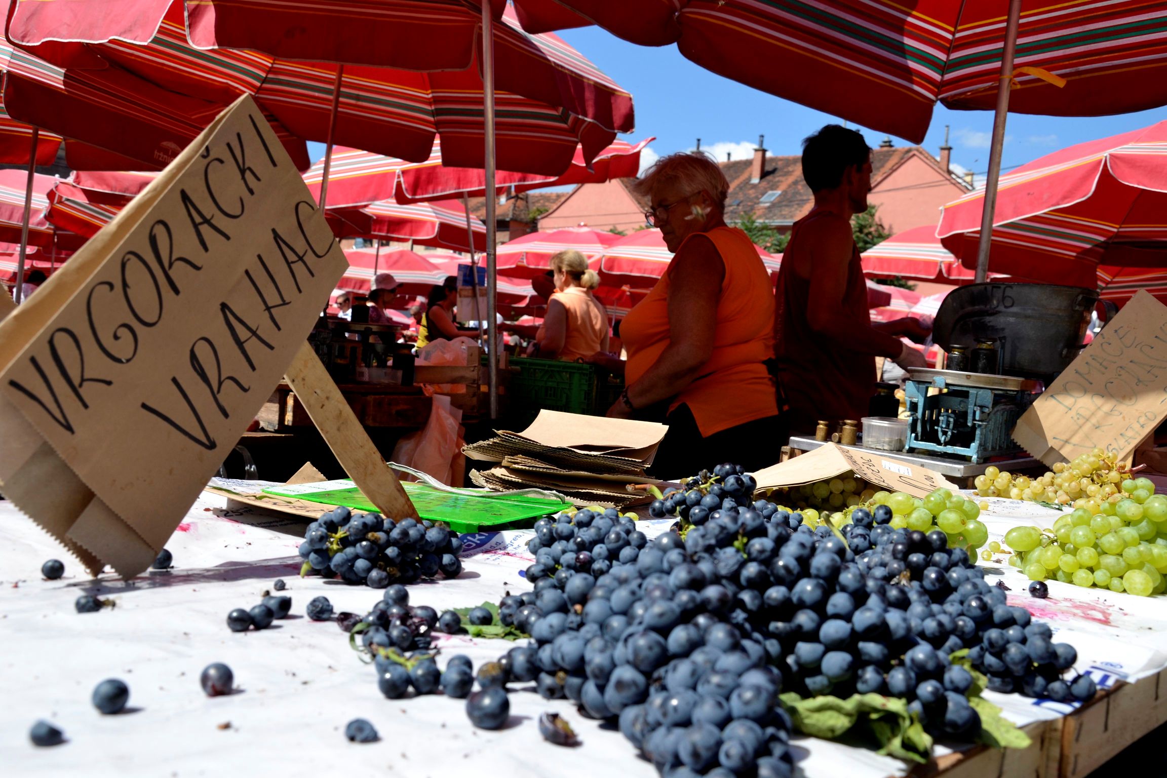 Volti e colori del mercato di Dolac. Il colore rosso degli ombrelloni domina la piazza e fa da sfondo a contadini che armeggiano con le vecchie bilance a piatti. Una galleria fotografica di Andrea Mella