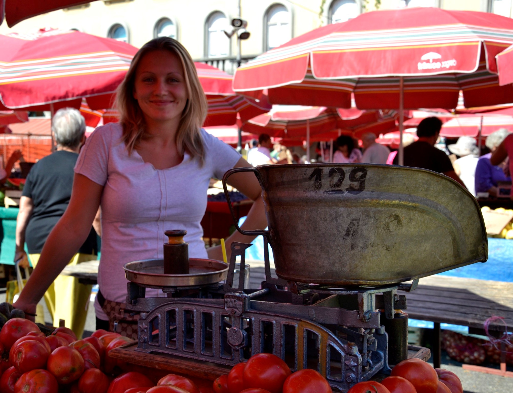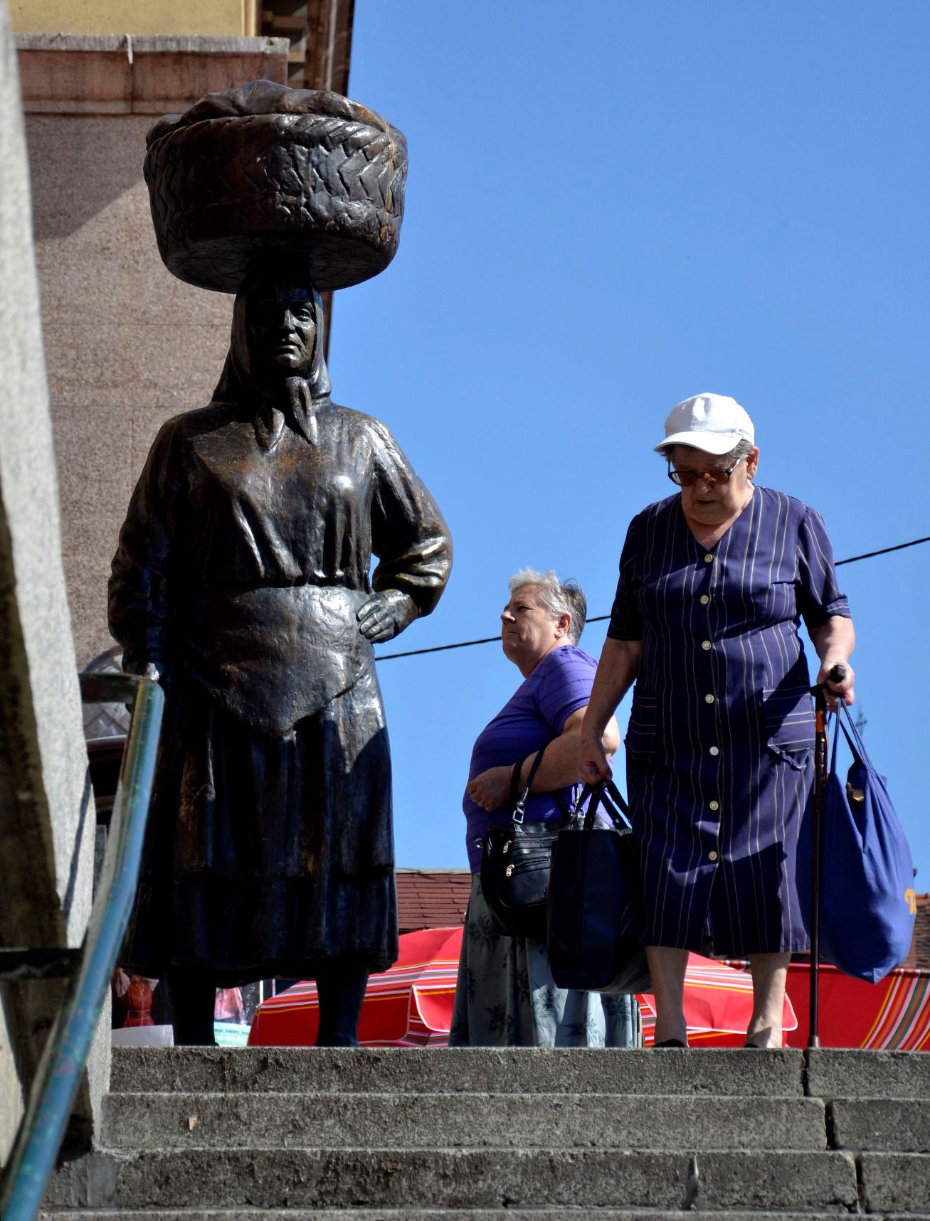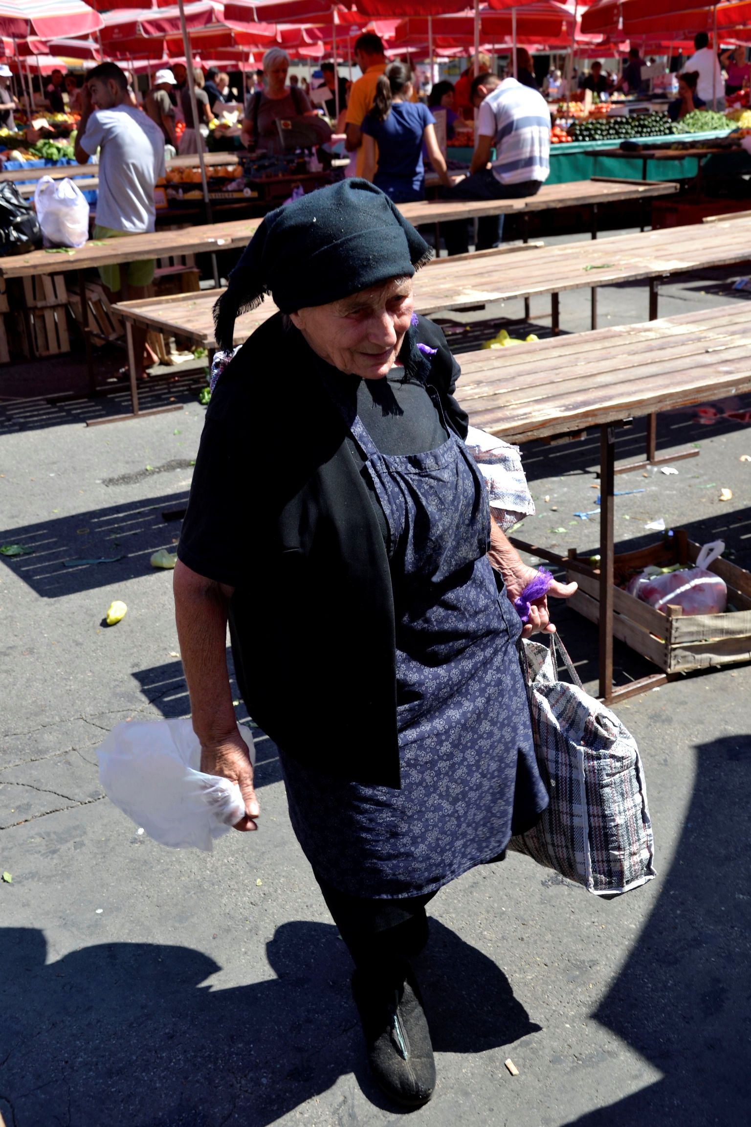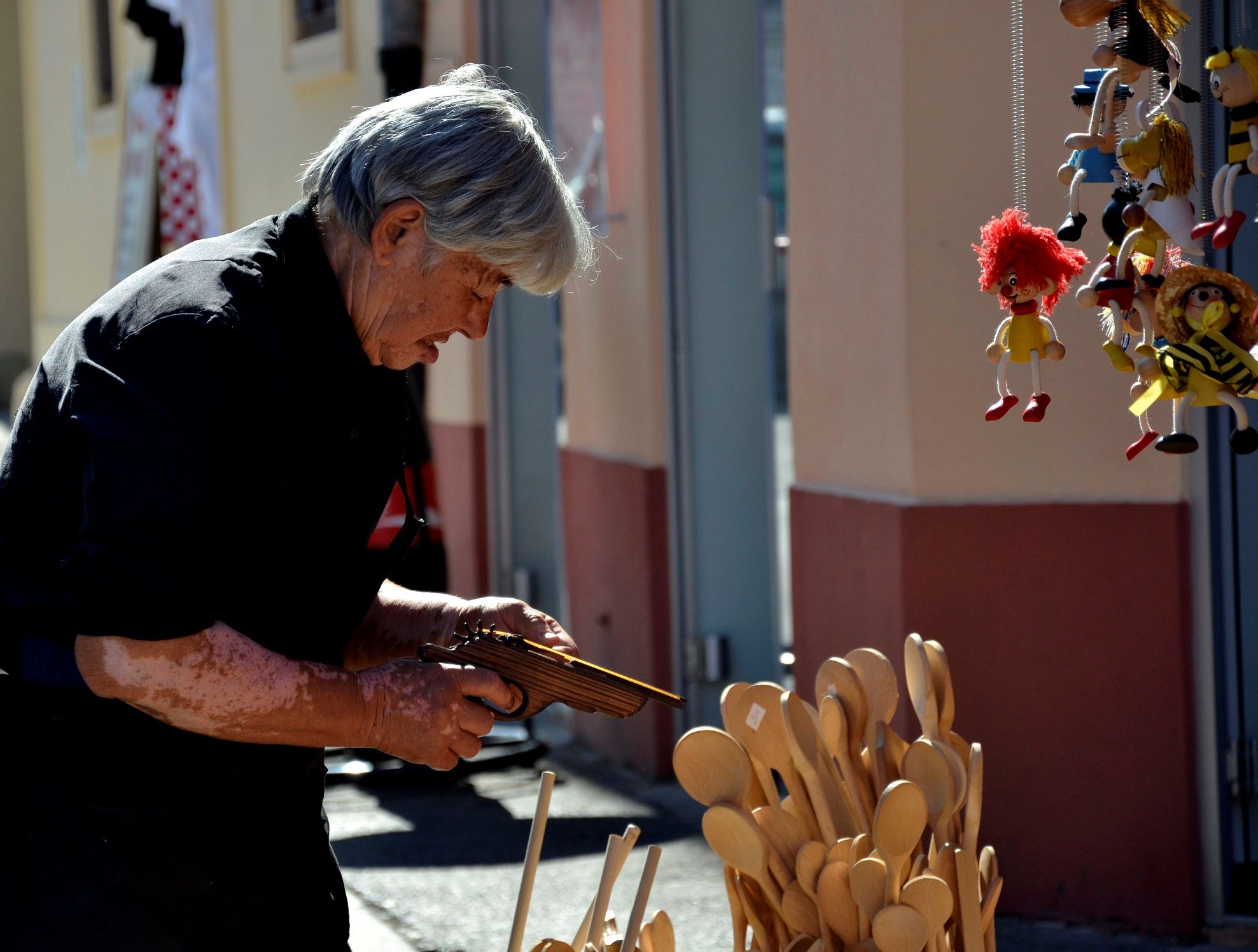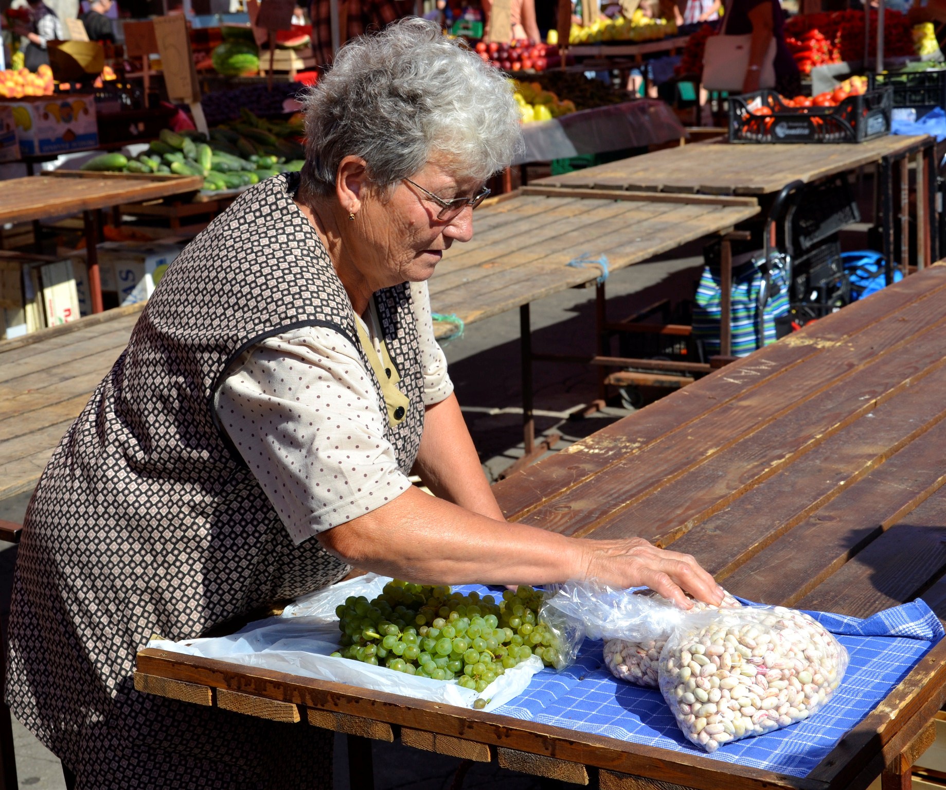 Volti e colori del mercato di Dolac. Il colore rosso degli ombrelloni domina la piazza e fa da sfondo a contadini che armeggiano con le vecchie bilance a piatti. Una galleria fotografica di Andrea Mella