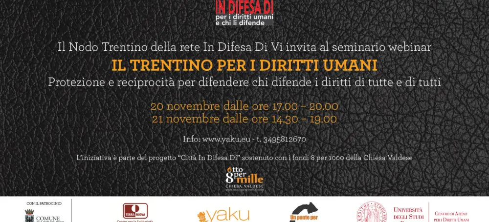 “Il Trentino per i diritti umani” è il terzo appuntamento internazionale che il Nodo Trentino – composto da Forum Trentino per la Pace, associazioni Yaku, PBI Italia, Amnesty International, il Centro per la Cooperazione Internazionale, l’Università di Trento con Scholar At Risk – coordina sul territorio, insieme ad una fitta rete di organizzazioni, nazionali ed internazionali, università ed enti locali, per la costruzione del primo programma per la difesa delle e dei difensori dei diritti umani in Italia.