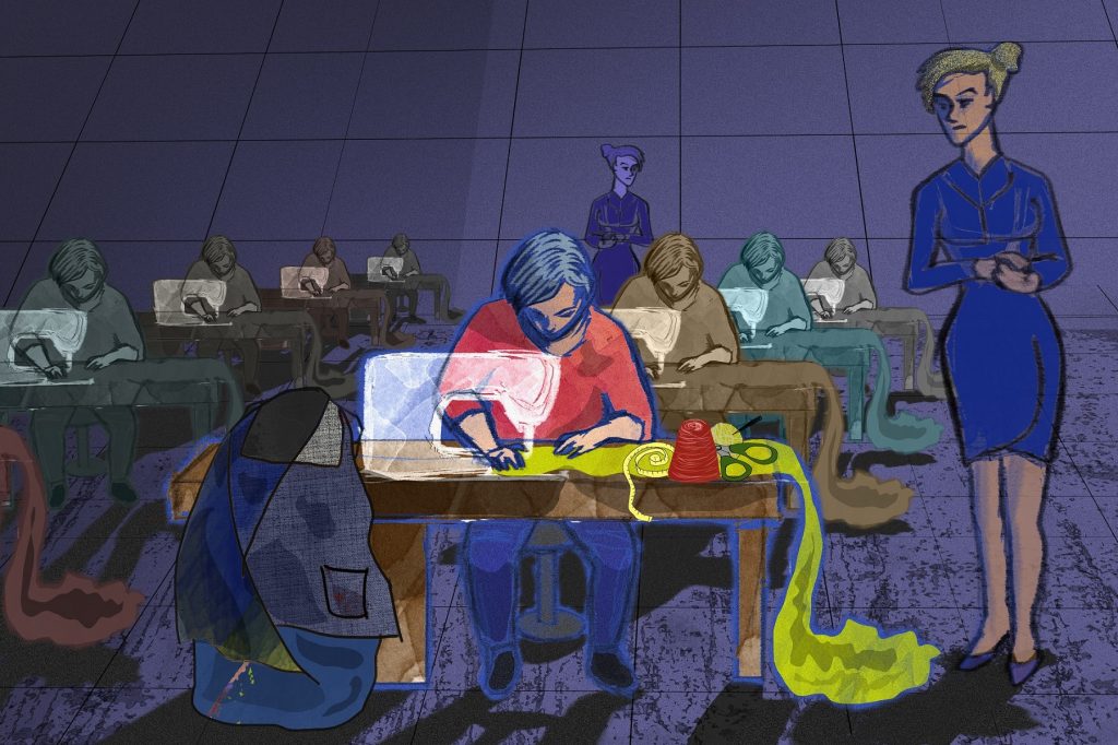 Nella stanza eravamo circa trenta persone, circondate dal costante frastuono delle macchine interrotto ogni tanto dalle urla che i lavoratori si scambiavano con i supervisori.