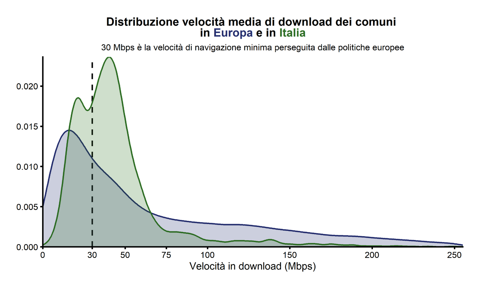 Un altro caso in cui le differenze interne sono rilevanti è quello dell’Italia, per cui i dati rilevano forti differenze fra i centri urbani medio-grandi e le zone rurali. Lo si evince dal grafico della distribuzione della velocità di connessione media dei comuni italiani: si possono notare due picchi, che rappresentano una maggiore frequenza di città attorno al valore di riferimento di 30 Mbps in download, di cui uno è leggermente al di sotto della soglia e l’altro al di sopra.
