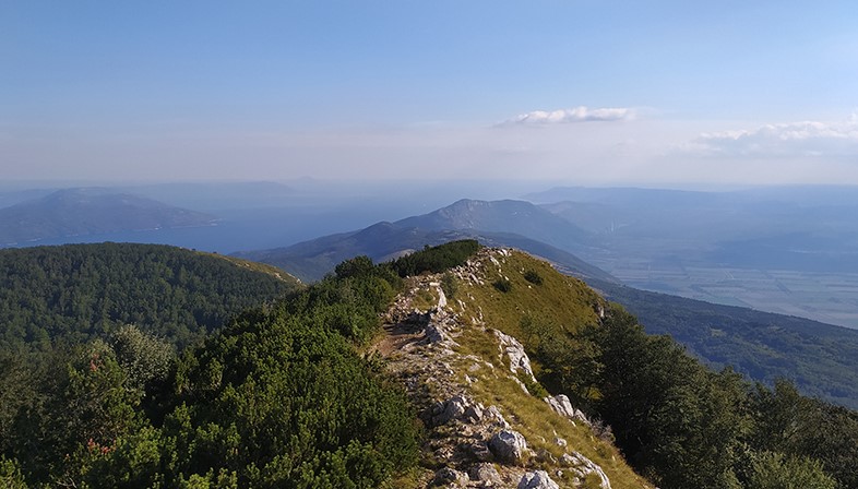 Dopo Chersano la strada scende e attraversa una piana coltivata, terre bonificate negli anni Trenta del Novecento. Il sole è allo zenith e alla mia destra s’alza imperioso il Monte Maggiore. Pedalo in direzione di Vranja, Aurania in italiano, e subito dopo il villaggio attraverso un binario che corre in un paesaggio western. La mia strada secondaria sfiora la nuova A8 che permette, con una lunga galleria, di abbreviare il viaggio per Abbazia e poi Fiume. Io invece do l’attacco alla montagna. Durissimi i primi chilometri, con una pendenza che in alcuni tratti arriva al 15 percento. Procedo pianissimo, sudando e bordeggiando, usando un termine marinaresco. Qui non è il vento che devo risalire, ma la salita che provo ad ammorbidire. Piano, piano comunque supero questa prova, perché poi le pendenze rimangono impegnative ma non proibitive. La strada attraversa boschi prima di latifoglie, poi di conifere, fino quasi a raggiungere Poklon, quattro case e un bar-ristorante a quasi 1.000 m. Da lì la strada principale scende in direzione di Abbazia, mentre io svolto un po’ prima a destra per quella che porta in vetta. Tornanti prima tra il bosco, poi tra una vegetazione bassa, con frequenti precipizi a sinistra, in direzione est. Viste mozzafiato sulle acque del Quarnero, che in linea d’aria distano solo 5 chilometri, con un salto di 1.200 metri! e sulla riviera di Fiume che sempre in linea d’aria sarà a circa 20 chilometri.