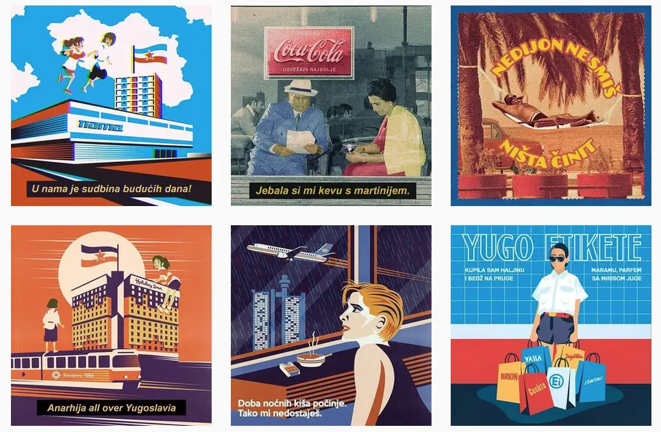 Ivana Ljubičić pubblica i suoi collage digitali ispirati dal gusto rétro sul profilo Instagram @amio_mon . Una serie dei suoi collage, intitolata “SFRetro Jugoslavija”, presentata nel corso di una mostra virtuale organizzata da Oblakoder nel febbraio 2020, ripropone le vecchie fotografie della Jugoslavia in un’ottica nuova. Ivana ha iniziato a realizzare collage un anno e mezzo fa. “Non so come esattamente io abbia deciso di occuparmi della Jugoslavia, ma mi sembra una scelta del tutto logica. Non sono l’unica ad essere attratta da questo stile rétro, anzi, mi sembra che oggi sia molto in voga, sia nell’ambito delle arti visive sia in quello della musica. La Jugoslavia è un vero e proprio patrimonio vintage della nostra regione”, afferma Ivana.