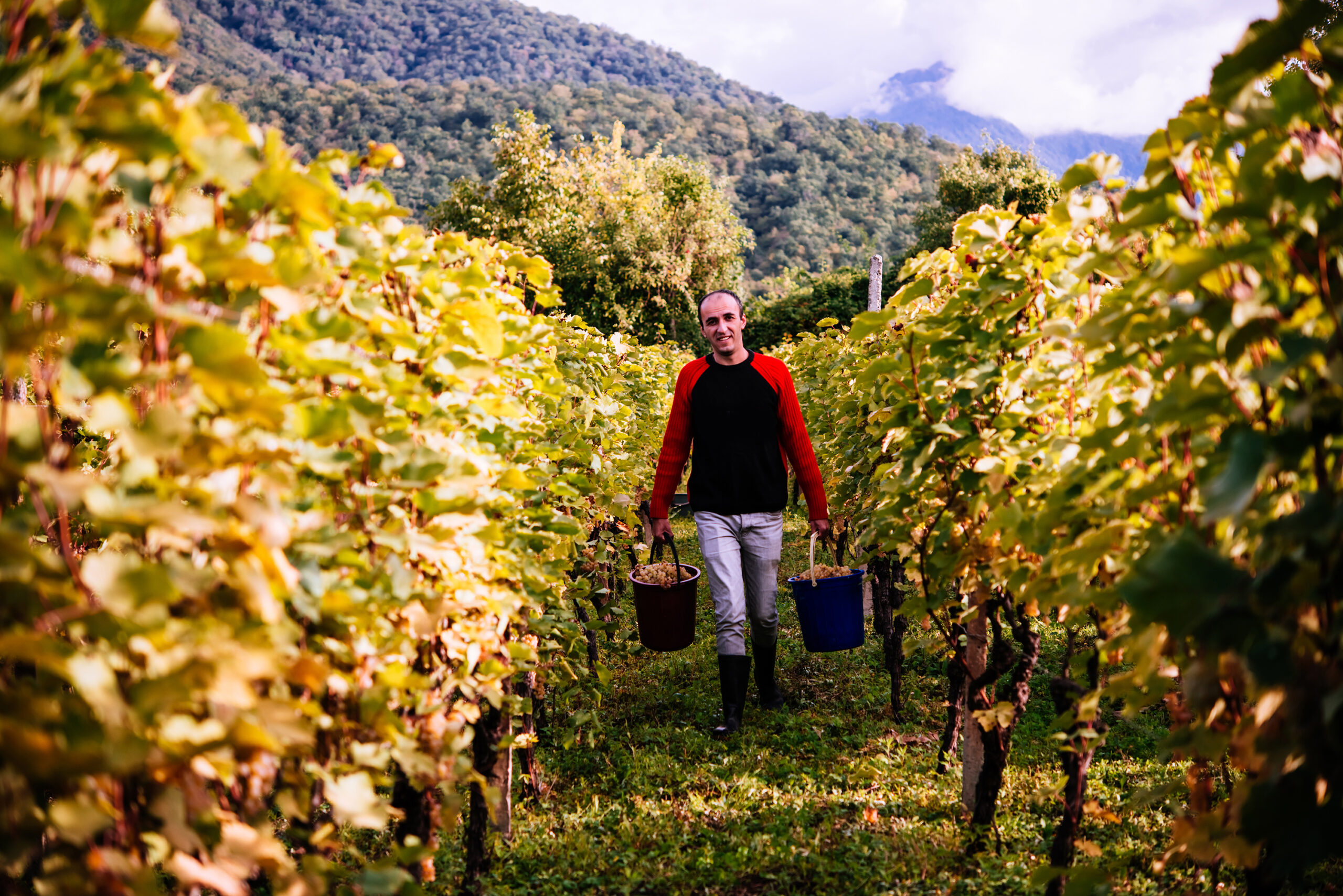 Scendendo dall’auto ciò che vedo è indescrivibile. I filari di vite, ordinati e già carichi di frutti, prendono il sole del tardo pomeriggio. Alle spalle le montagne, il Grande Caucaso. I colori che degradano dal cielo azzurro al marrone della terra dissodata sulla quale poggio i piedi, cangiano dal verde profondo delle foreste sui monti, al blu inverosimile delle parti già adombrate. Le foglie brillano verdi illuminate dal crepuscolo incipiente. Presto quel cielo si tinge di rosa. Torniamo indietro, prima che arrivi il buio.